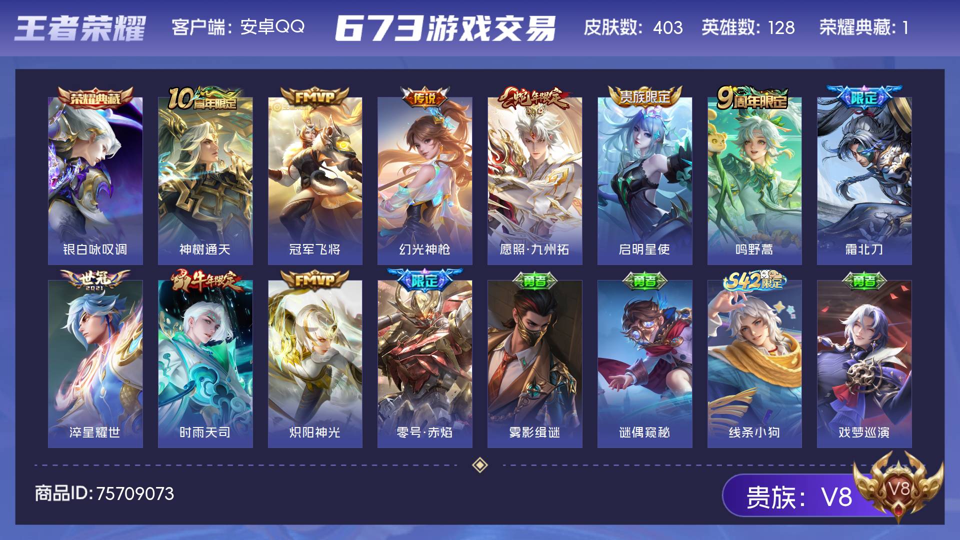 V8 皮肤403 英雄128 永恒钻石 荣耀典藏1 传说11 其他皮肤397