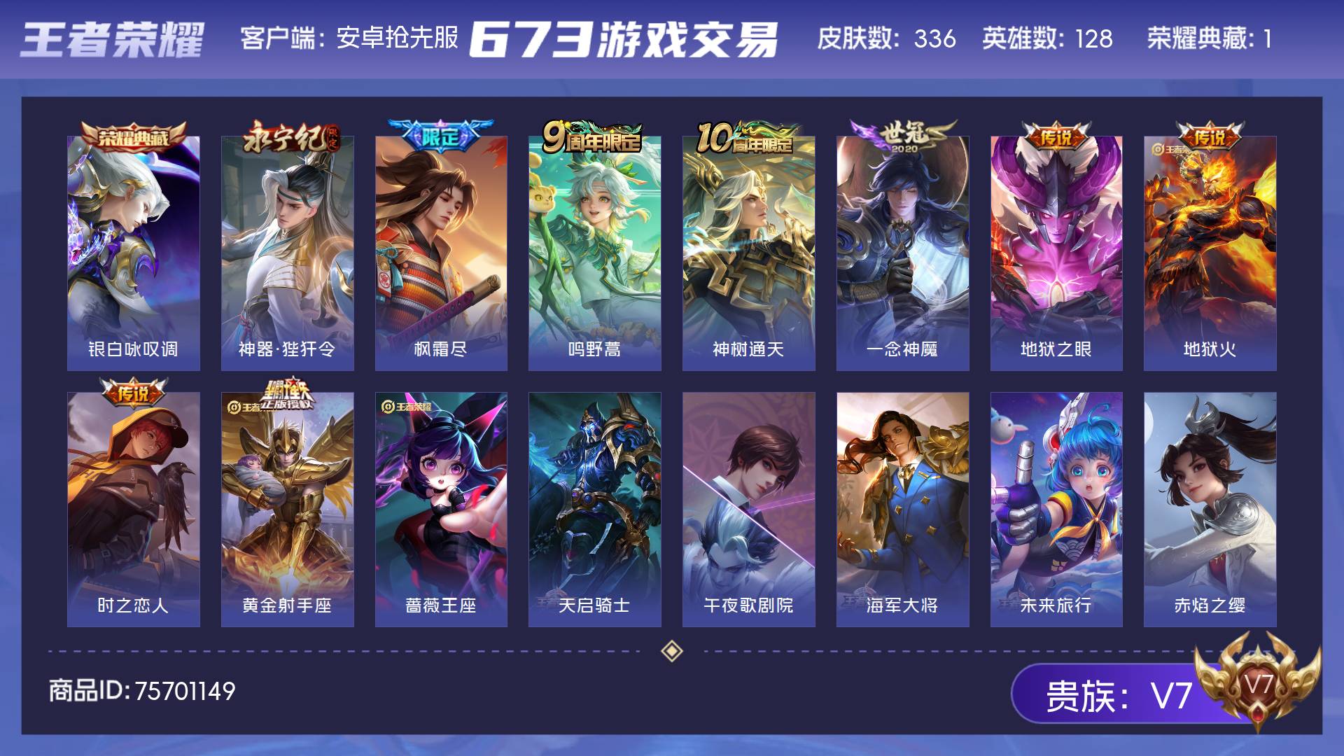 V7 皮肤336 英雄128 至尊星耀 荣耀典藏1 星传说3 传说9 其他皮肤331