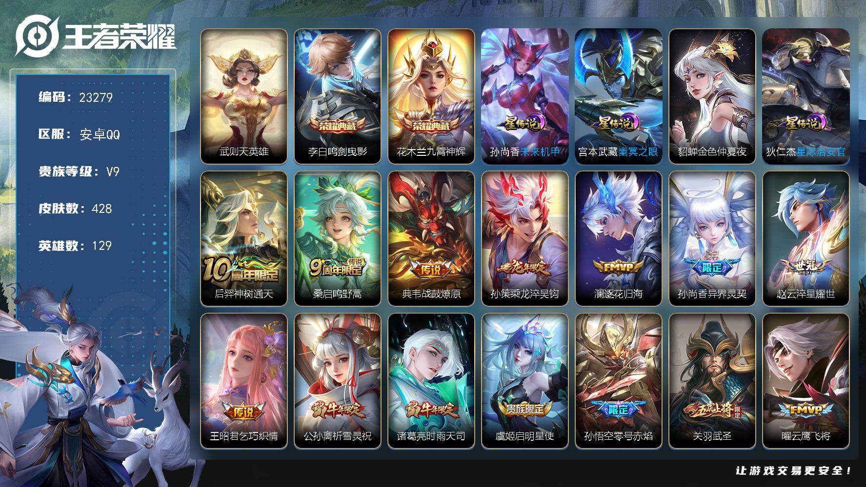 可换绑【V9优质高性价比·花木兰李白3典藏含武则天英雄·龙年孙策·祈雪灵祝·关