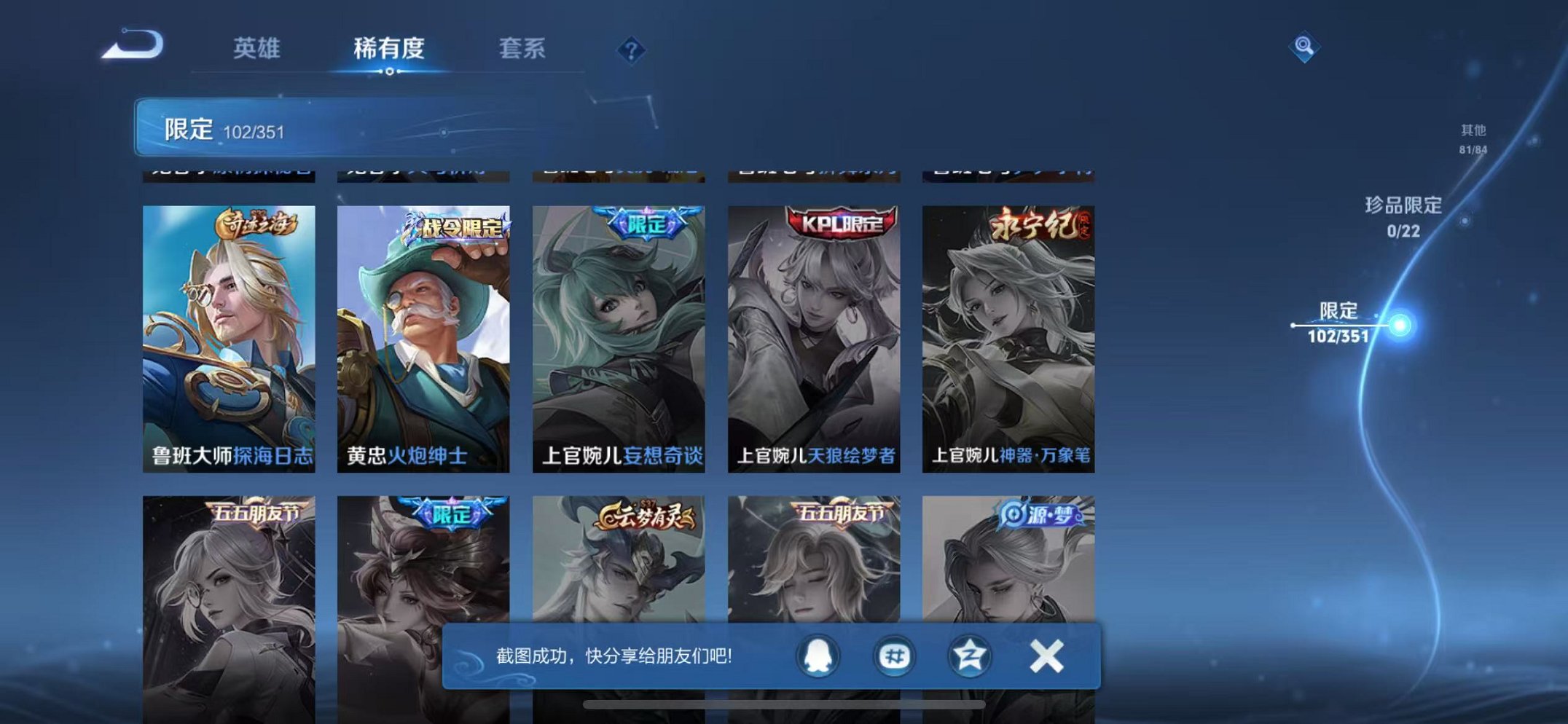 安卓QQ 皮肤350 英雄127 典藏1 无双1 珍品传说1 传说57 其他皮肤119 永恒钻石-