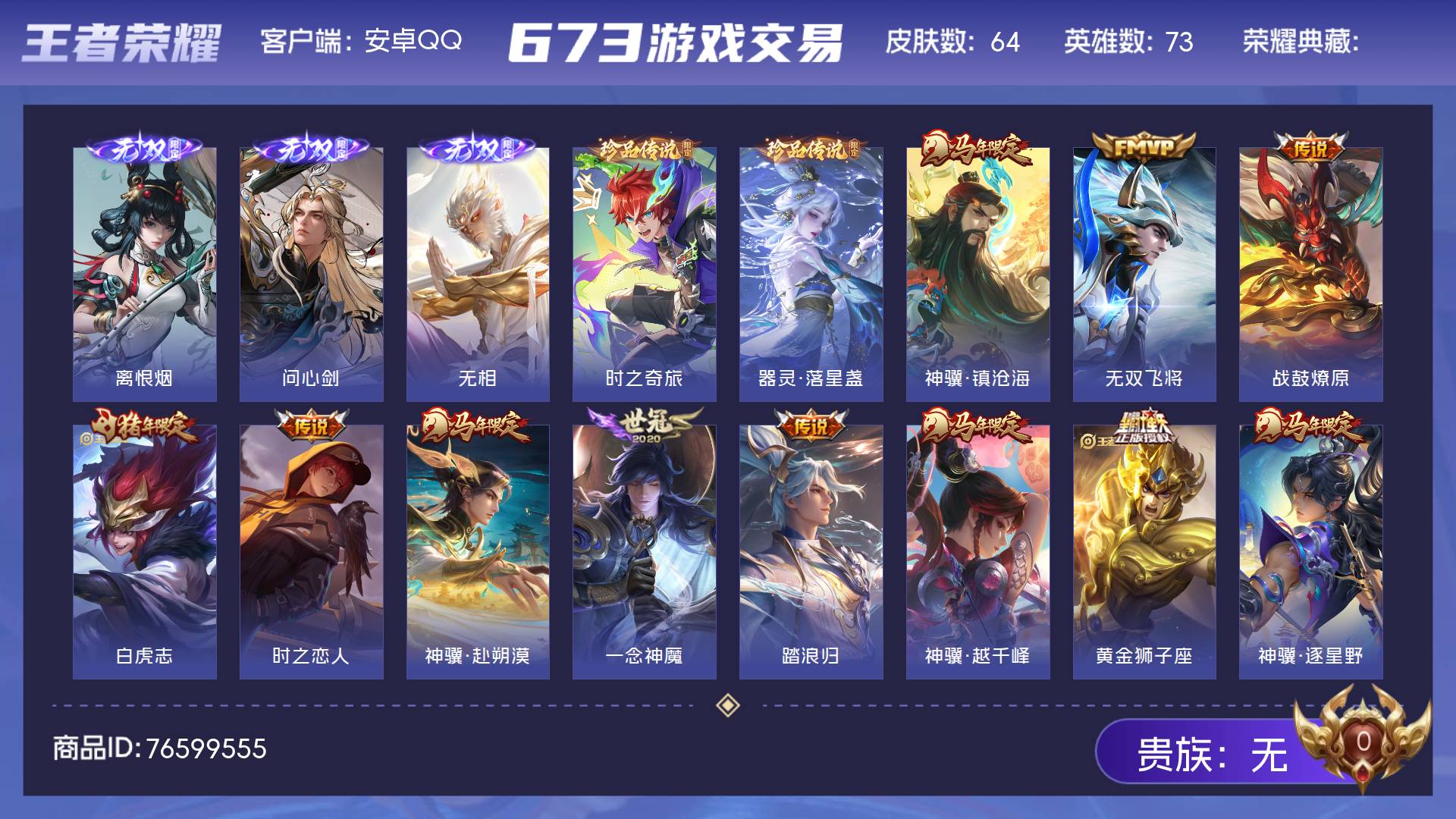 皮肤64 英雄73 绝世王者 无双皮肤3 珍品传说2 传说13