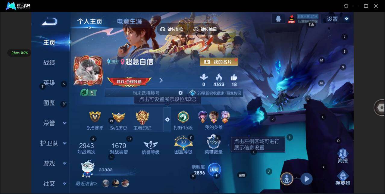 实名: 可修改 贵族等级: V8 英雄数: 127 皮肤数: 215 荣耀水晶