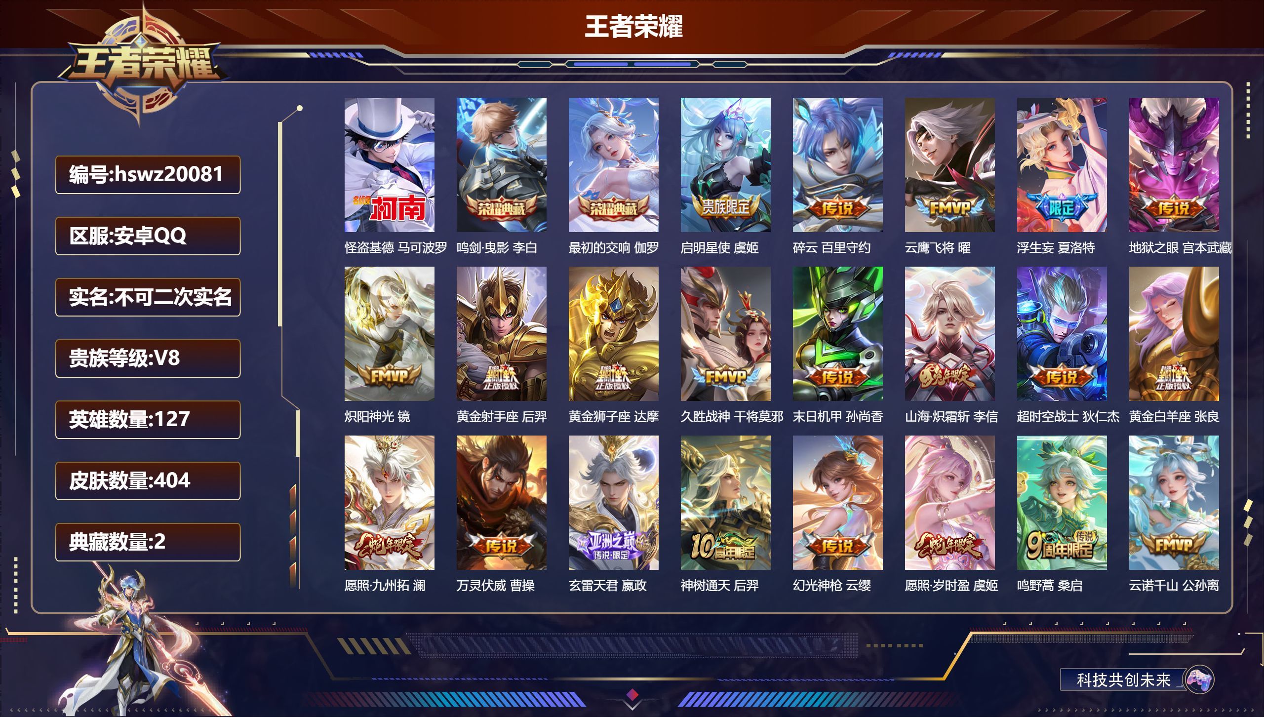 安卓QQ/绝世王者/404皮肤/127英雄/2典藏/0珍品无双/0无双/1珍品传说/21传说/125