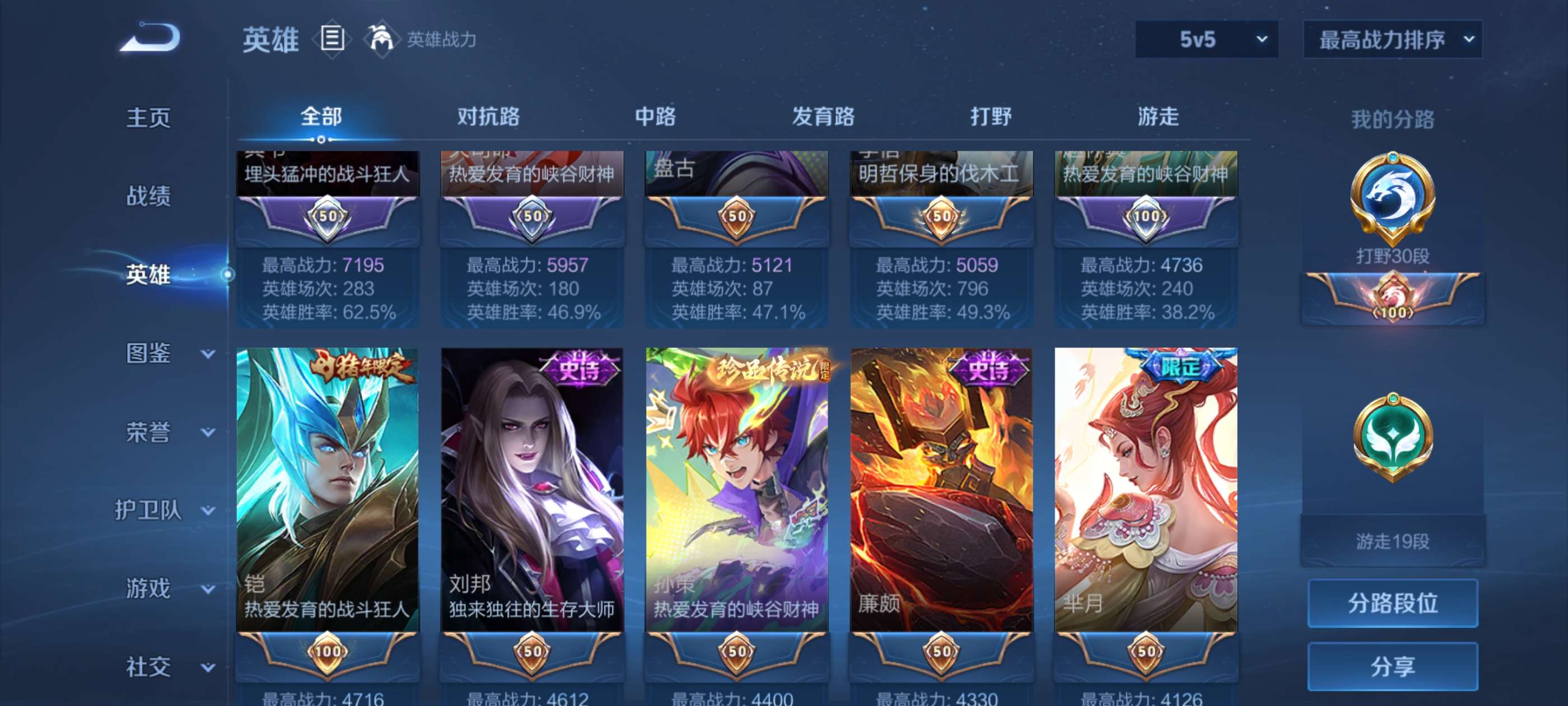 贵族等级: V6 英雄数: 92 皮肤数: 84 传说皮: 超时空战士-狄仁杰