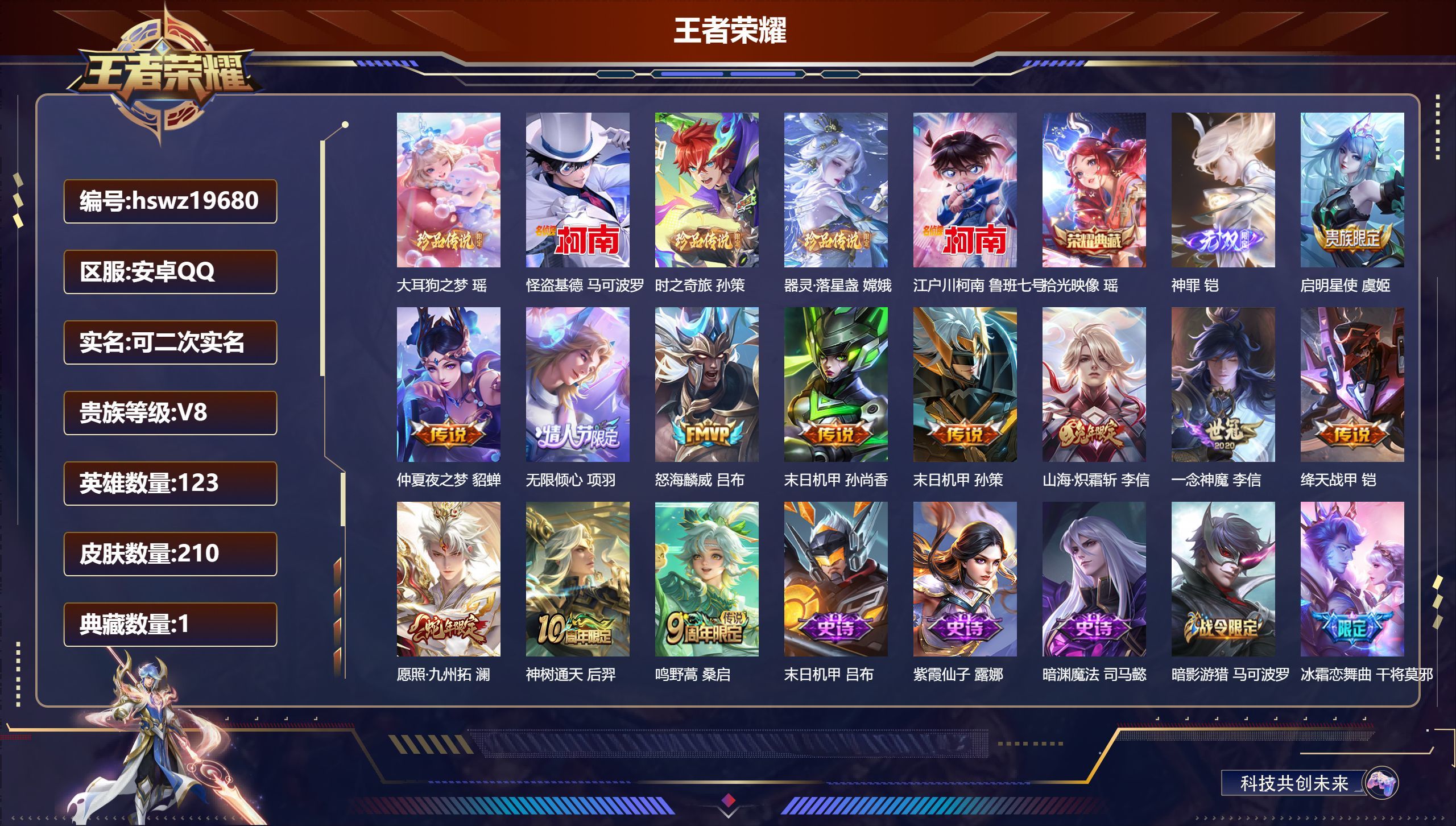 安卓QQ/荣耀王者/210皮肤/123英雄/1典藏/0珍品无双/1无双/5珍品传说/12传说/61史