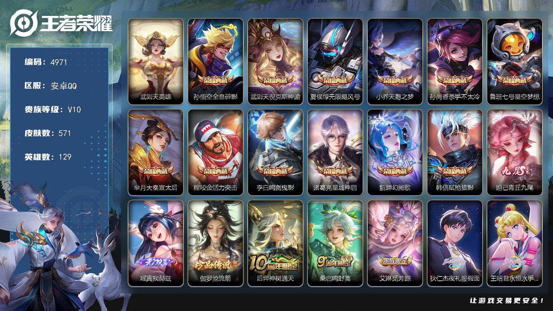 【马年限定全套】实名: 可修改 贵族等级: V10 英雄数: 129 皮肤数: