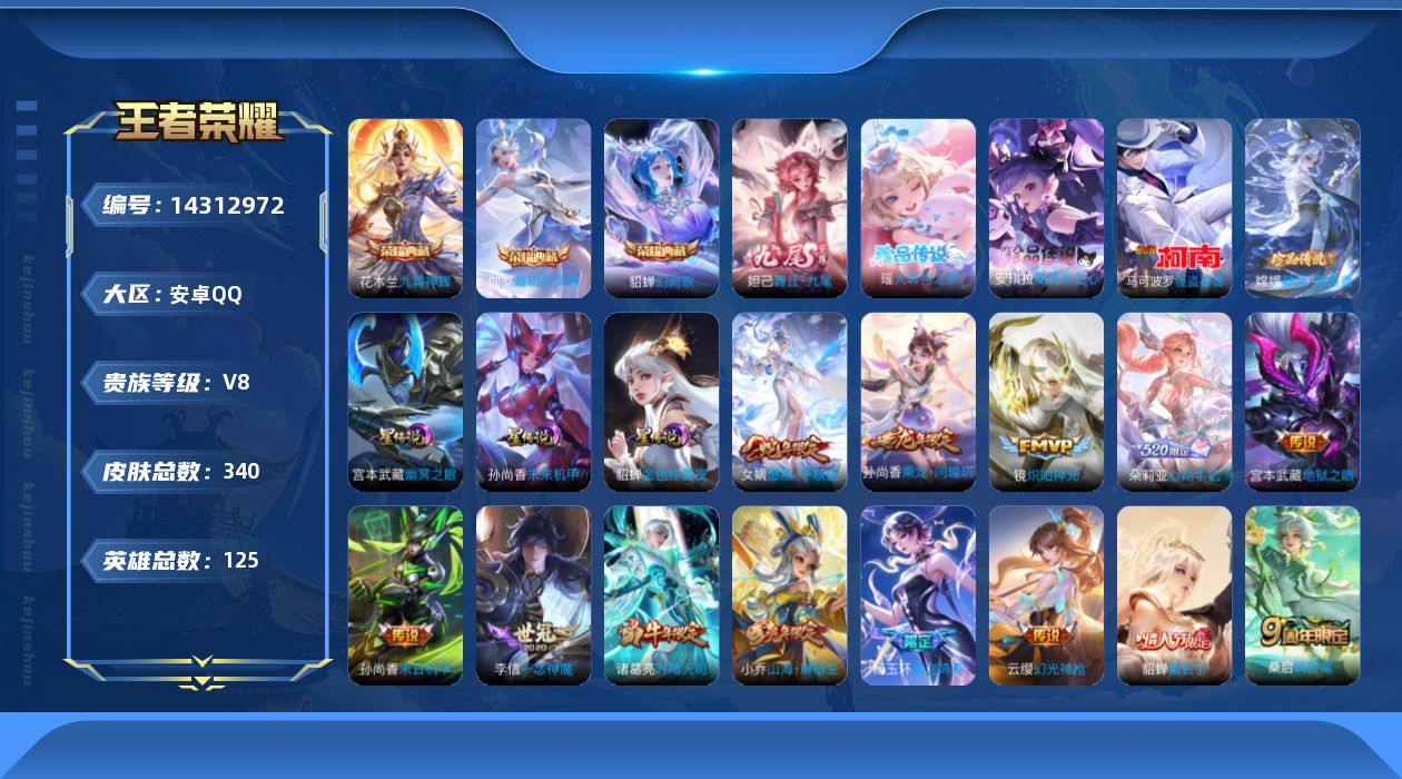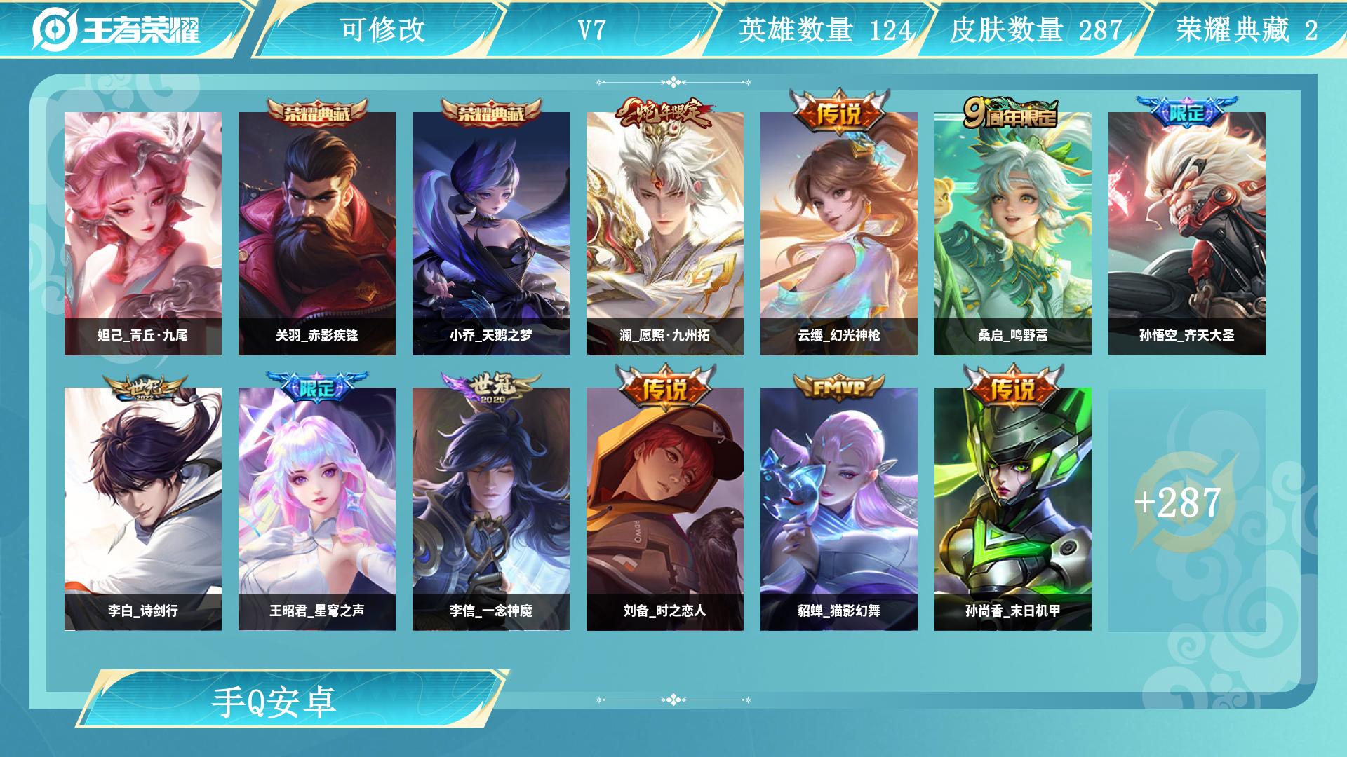 安卓Q-V2-至尊星耀IV段位-124英雄-161皮肤-9传说-44史诗【传