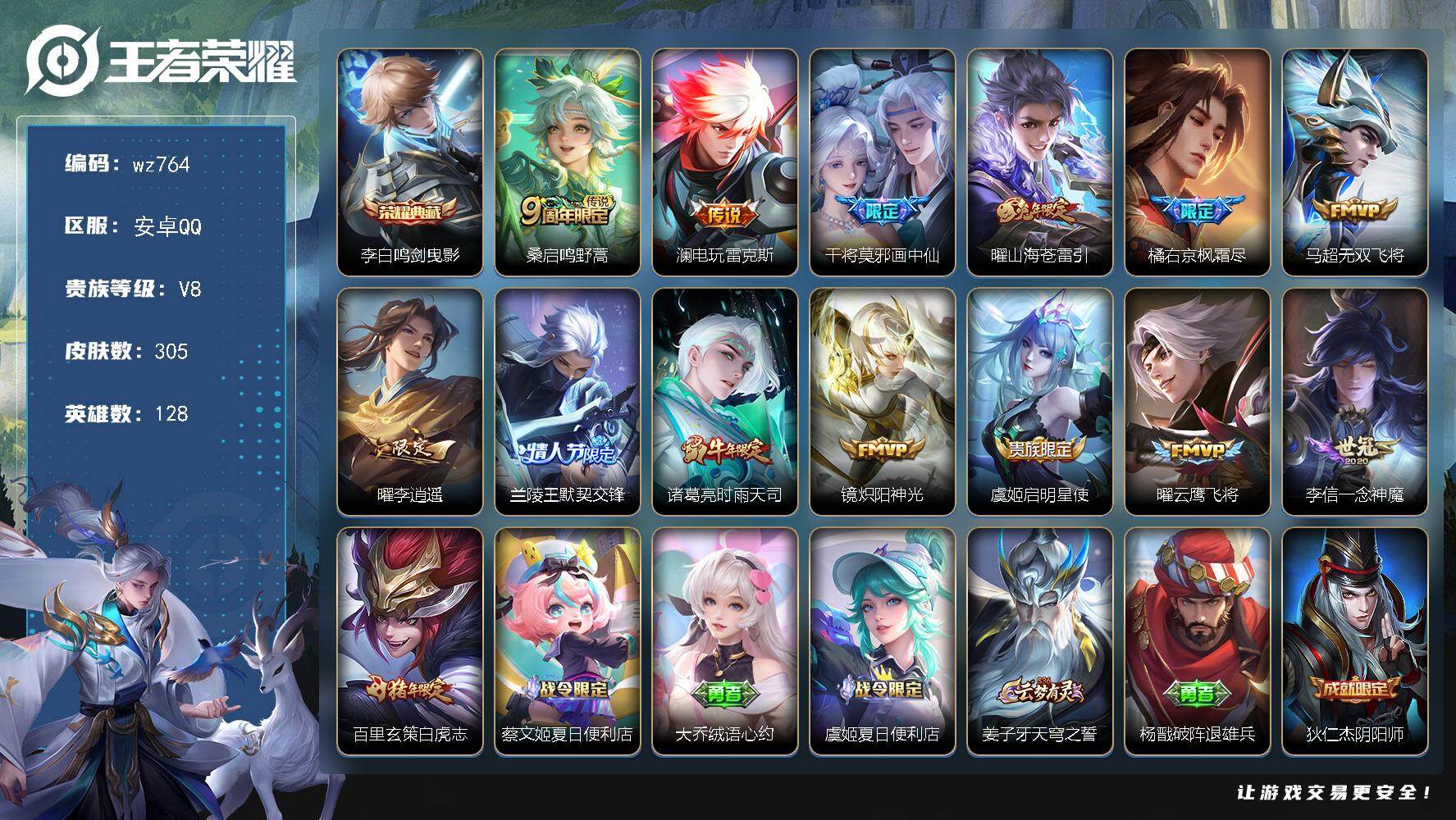 安卓Q-V8-尊贵铂金I段位-128英雄-305皮肤-1典藏皮肤-14传说-9