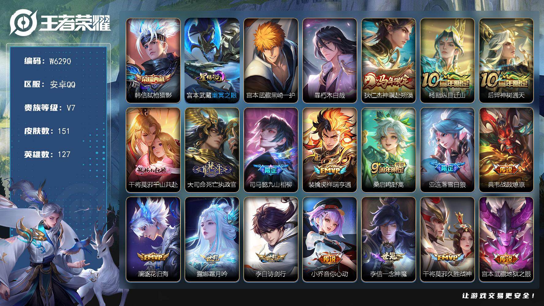 【W6290】安卓Q区-可二次-贵7-127英雄-151皮肤-1典藏-2珍品传