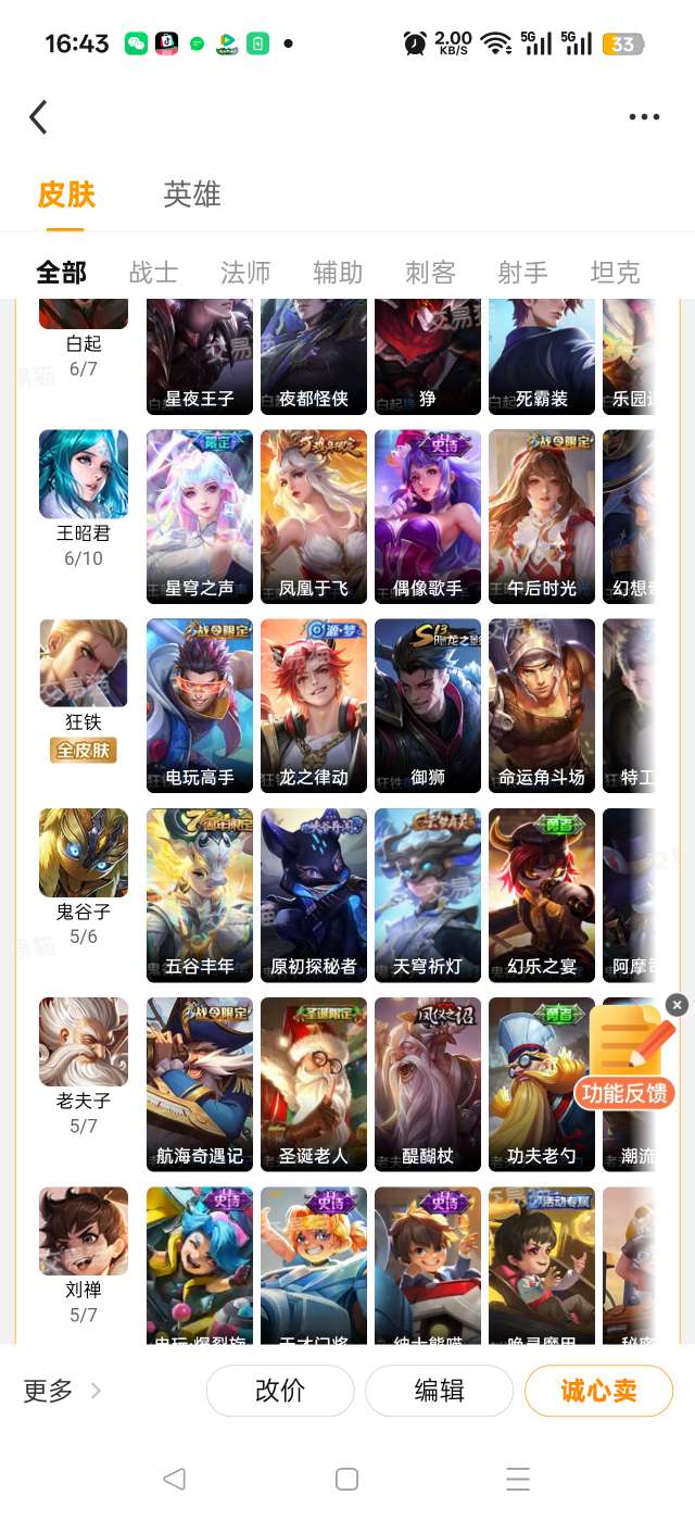 安卓QQ/无双王者/455皮肤/128英雄/2典藏/0珍品无双/3无双/3珍品传说/29传说/139