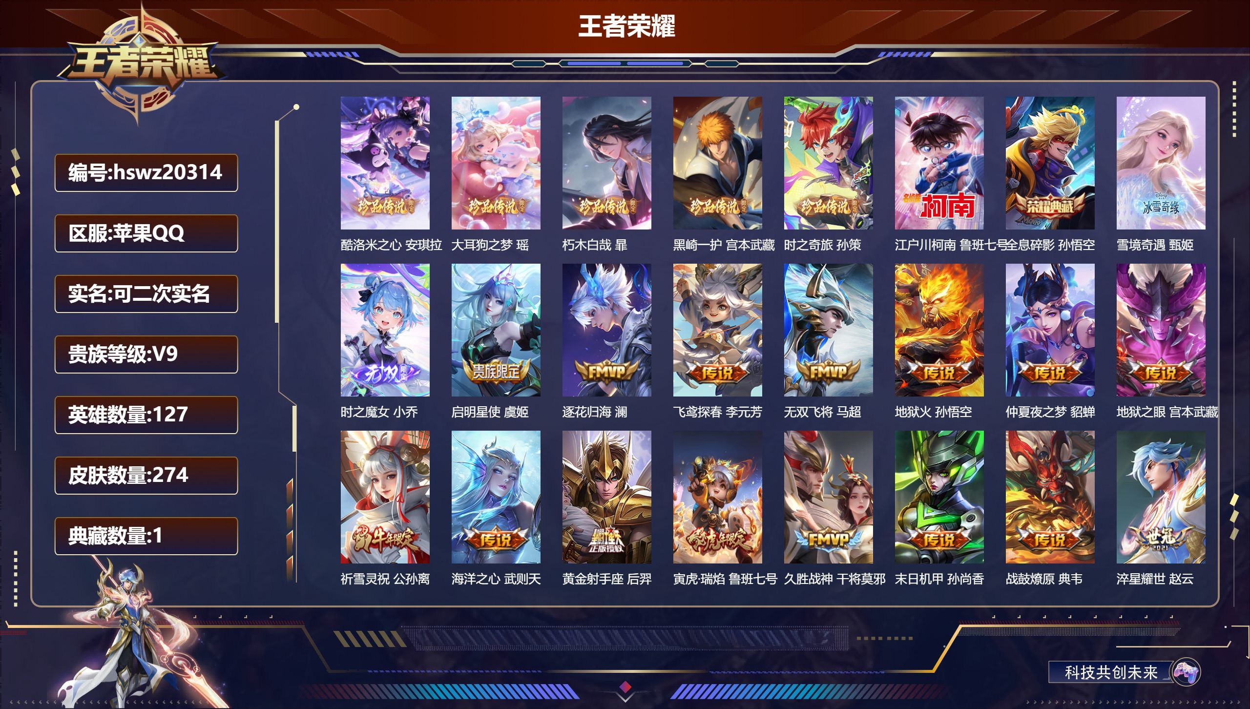 苹果QQ/至尊星耀/319皮肤/127英雄/2典藏/0珍品无双/2无双/0珍品传说/26传说/92史