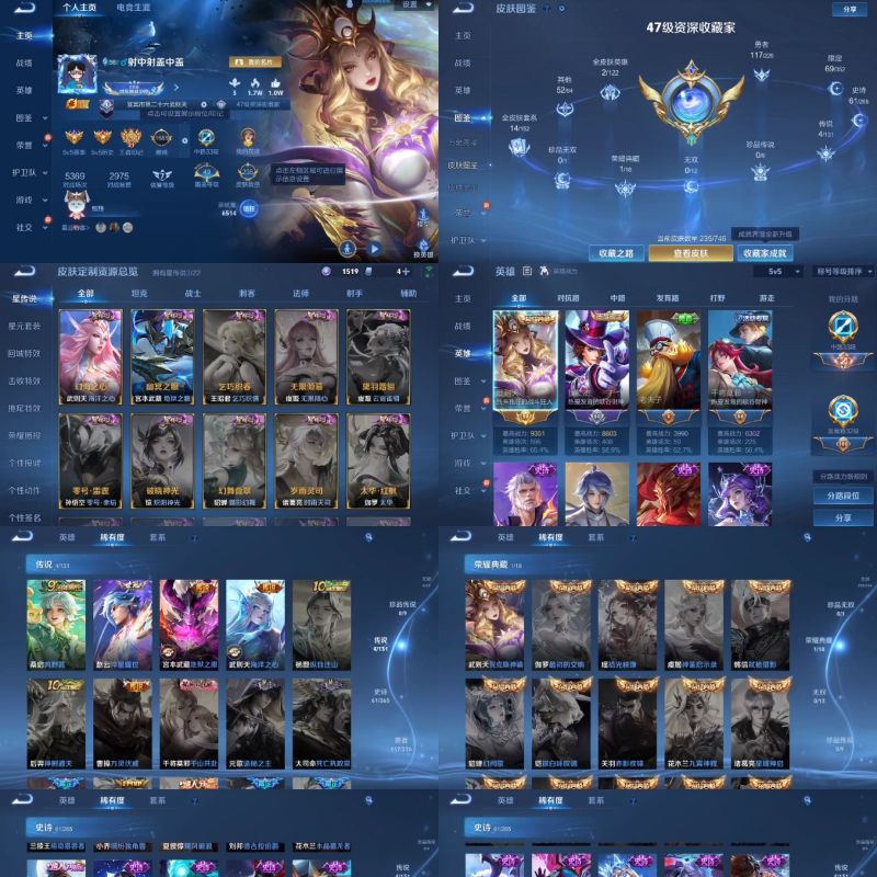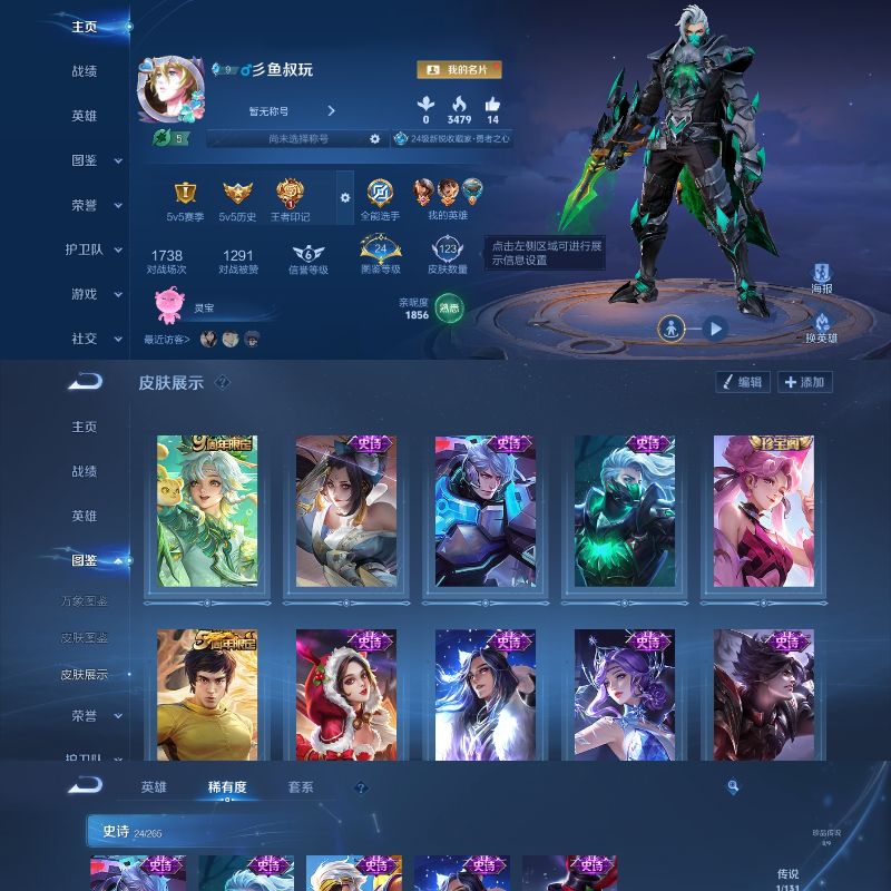 安卓QQ/最强王者/283皮肤/127英雄/1典藏/0珍品无双/3无双/3珍品传说/16传说/79史