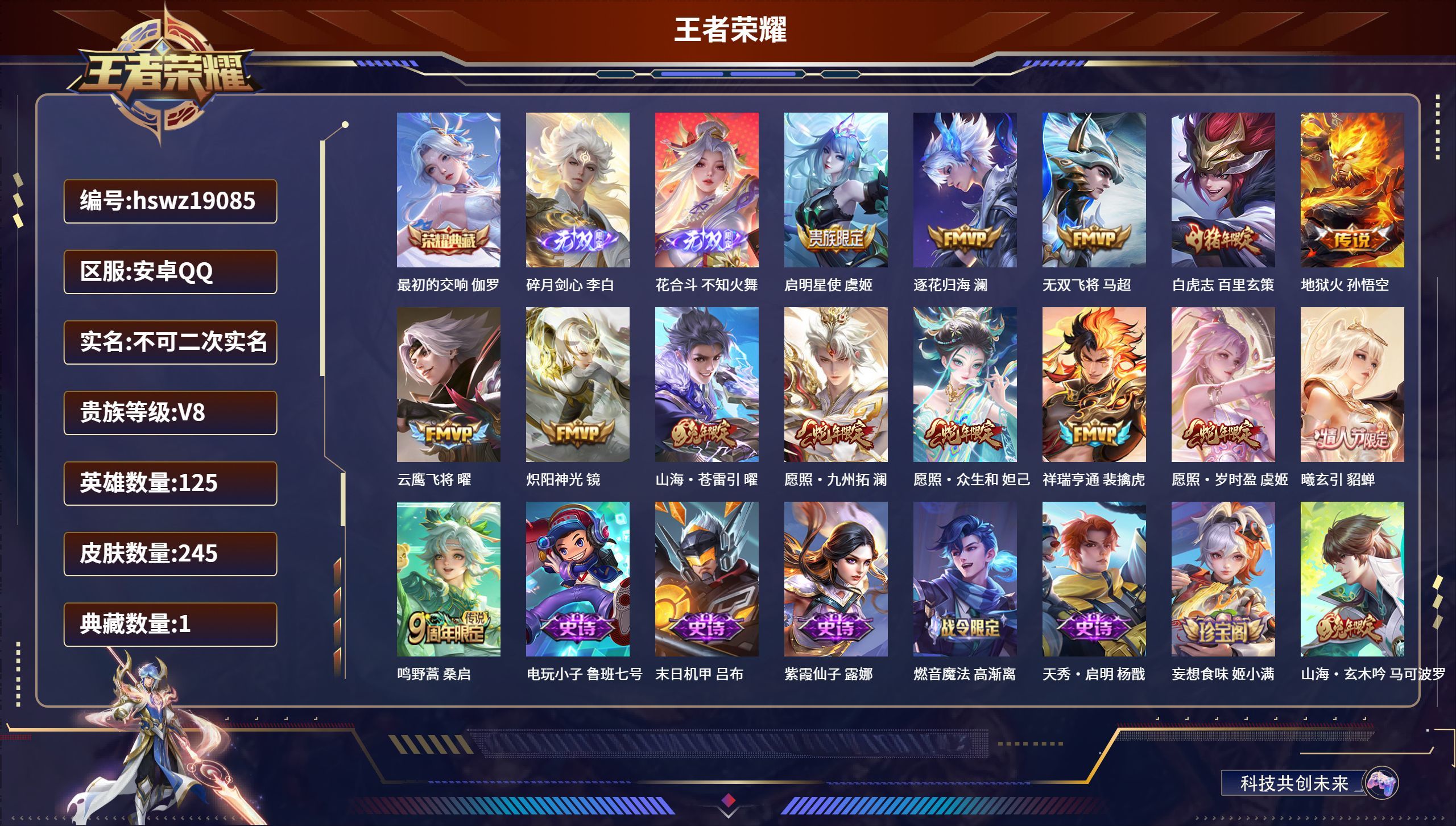 安卓QQ/荣耀王者/245皮肤/125英雄/1典藏/0珍品无双/2无双/0珍品传说/14传说/55史