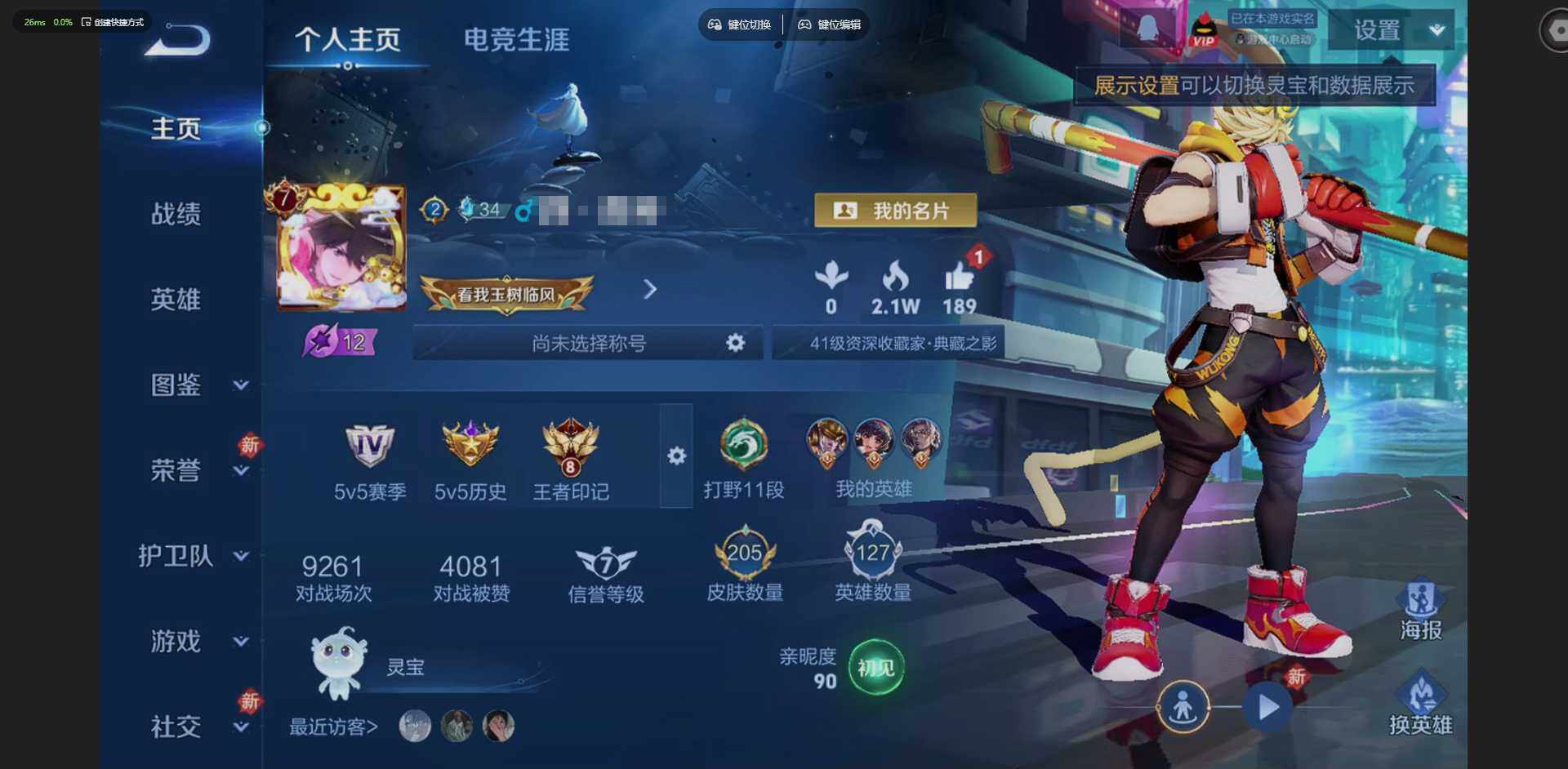 实名: 可修改 贵族等级: V7 英雄数: 127 皮肤数: 205 荣耀水晶