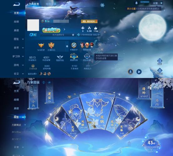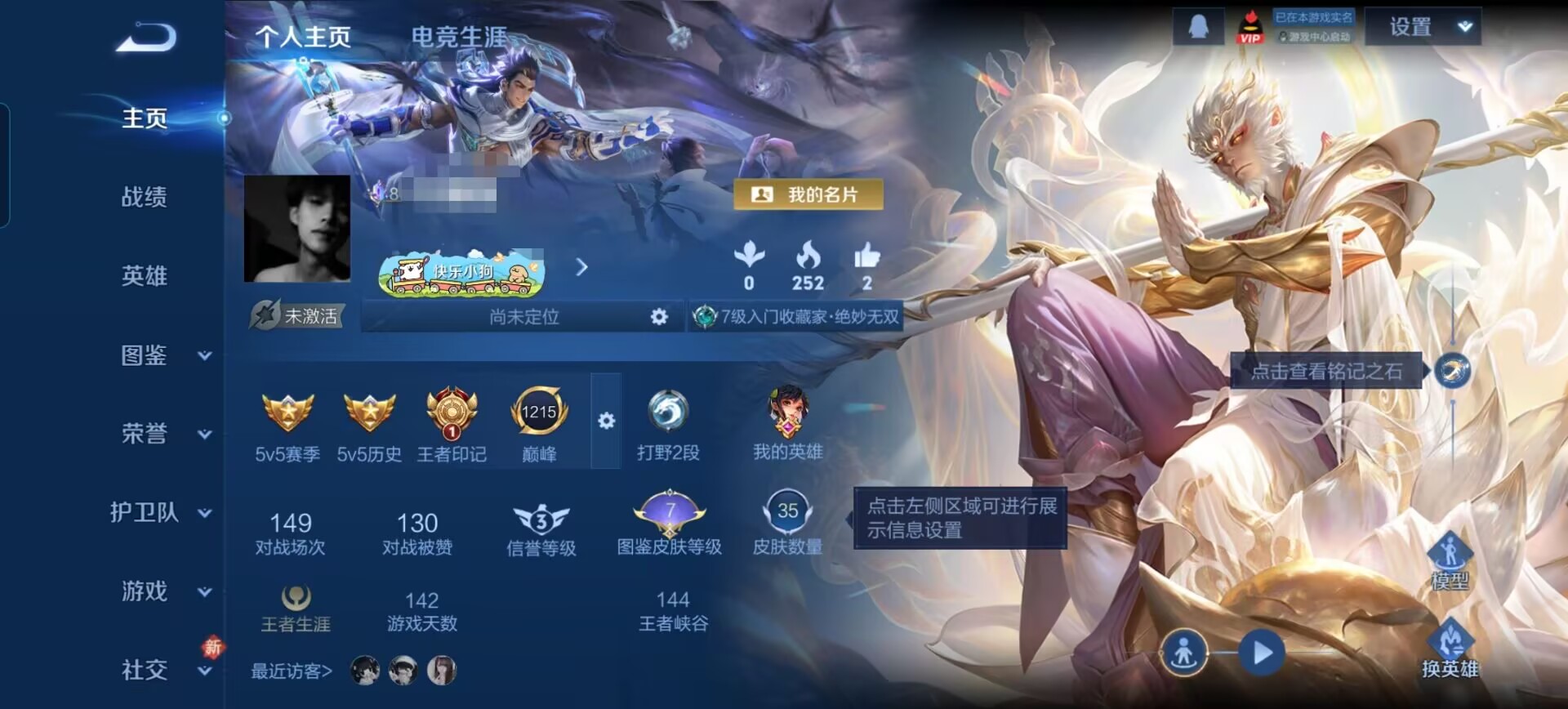 实名: 可修改 贵族等级: V7 英雄数: 128 皮肤数: 264 星传说: