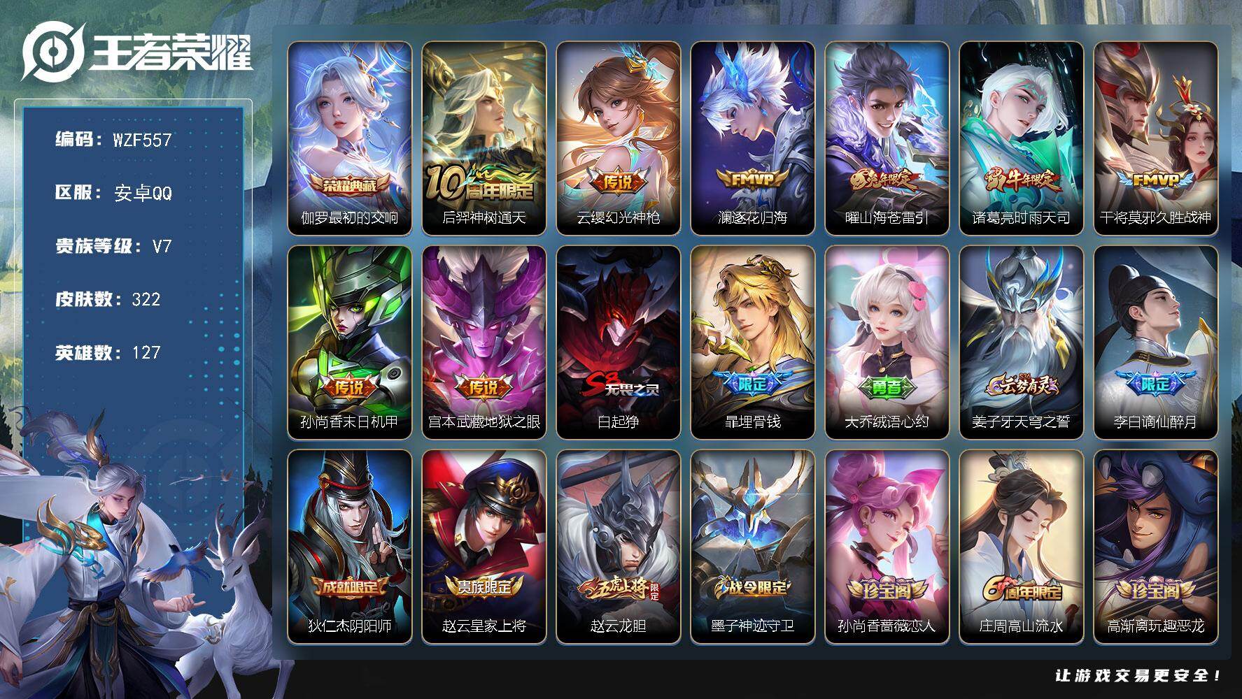 【WZF557】贵族7/皮肤322/典藏1/传说8/史诗101/英雄127/鬼