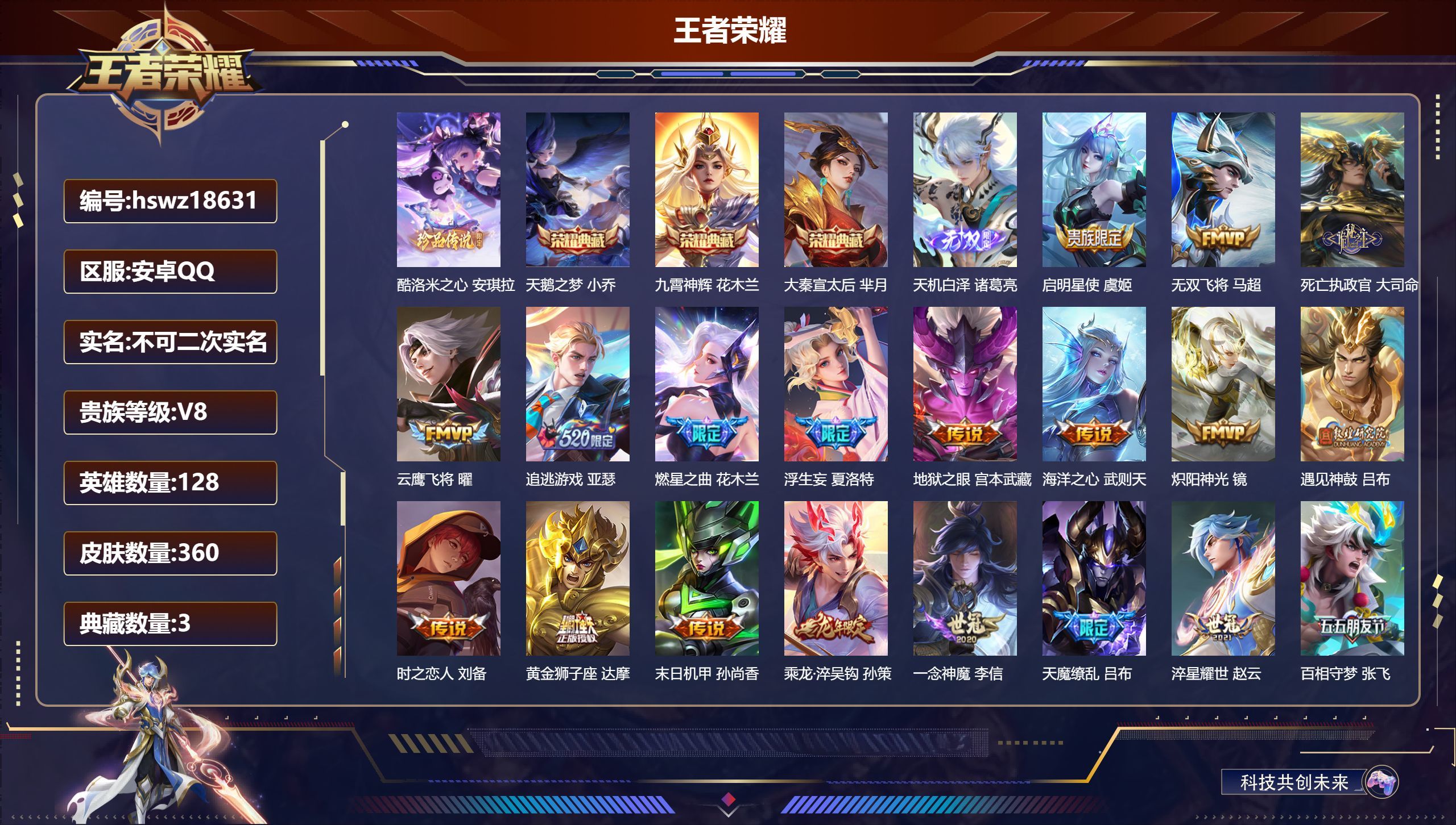 安卓QQ-1典藏-6传说-155皮肤-125英雄-无双王者-女号,,