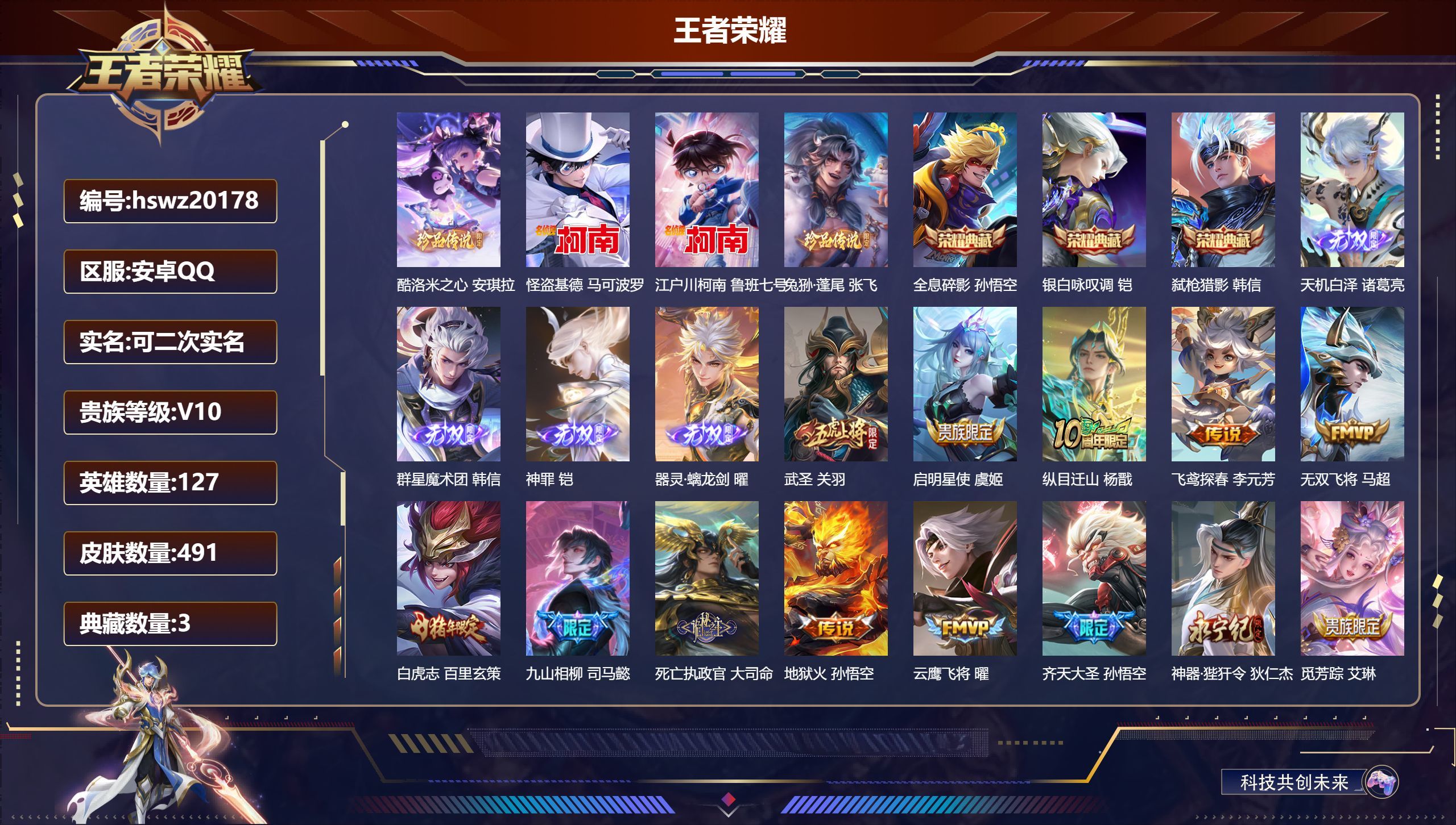 安卓QQ-1典藏-5传说-290皮肤-127英雄-至尊星耀-连体号自己看,相中了就直接买吧,不买的话就别问