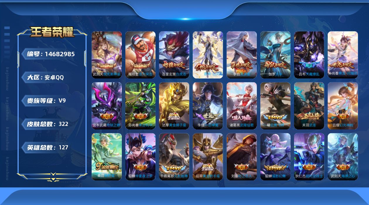 贵族等级: V9 英雄数: 125 皮肤数: 283 荣耀水晶: 全息碎影,拾