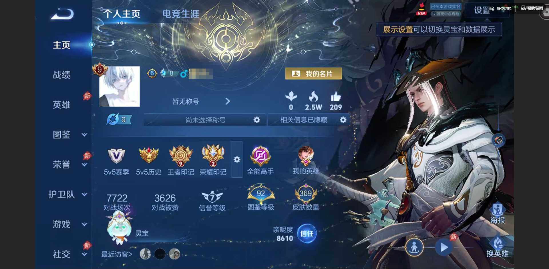 【金标司空震】贵族等级: V7 英雄数: 128 皮肤数: 234 荣耀水晶: