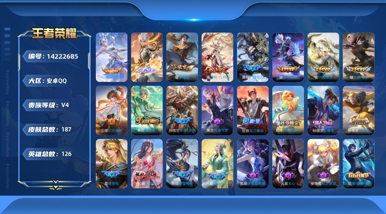 安卓QQ/无双王者/466皮肤/127英雄/5典藏/0珍品无双/1无双/0珍品传说/59传说/156