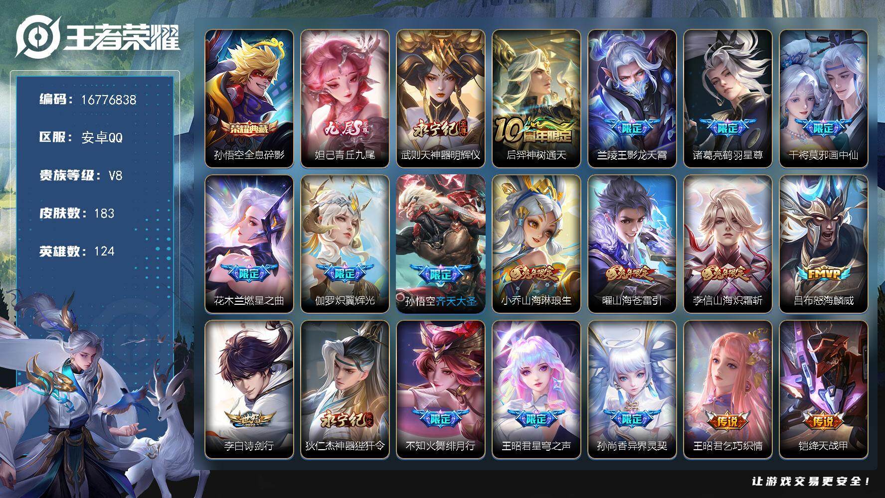 【16776838】贵族8/皮肤183/典藏1/传说23/史诗43/英雄124