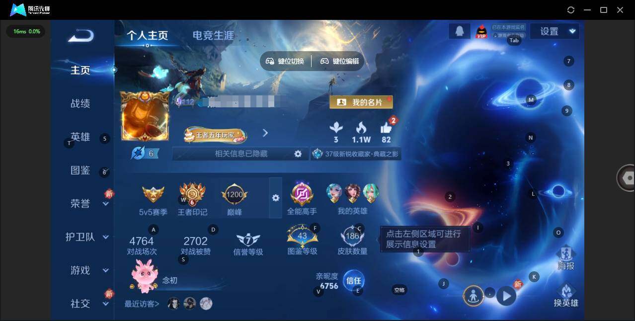 贵族等级: V6 英雄数: 125 皮肤数: 186 荣耀水晶: 星域神启 传