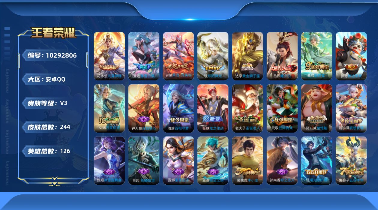 两个荣耀典藏,还有珍品,打野号,皮肤多,很划算