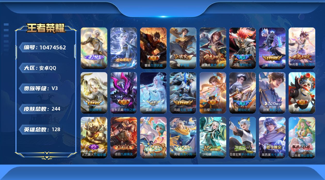 荣耀王者/231皮肤/128英雄/2典藏/1珍品无双/3无双/3珍品传