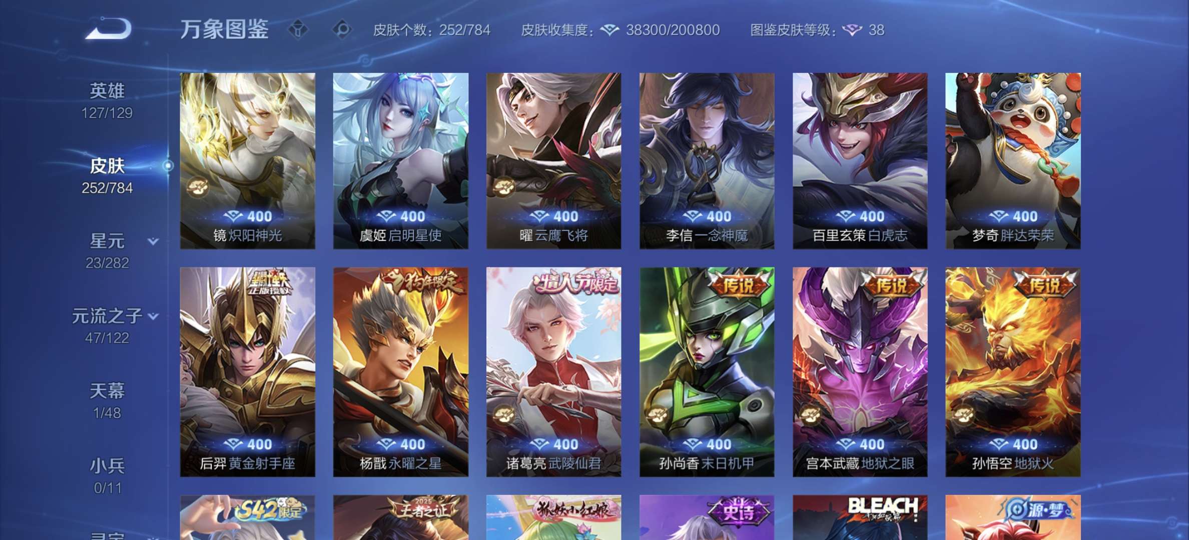 荣耀王者/310皮肤/128英雄/2典藏/0珍品无双/1无双/4珍品传说/22传说/79史诗/9稀有英雄