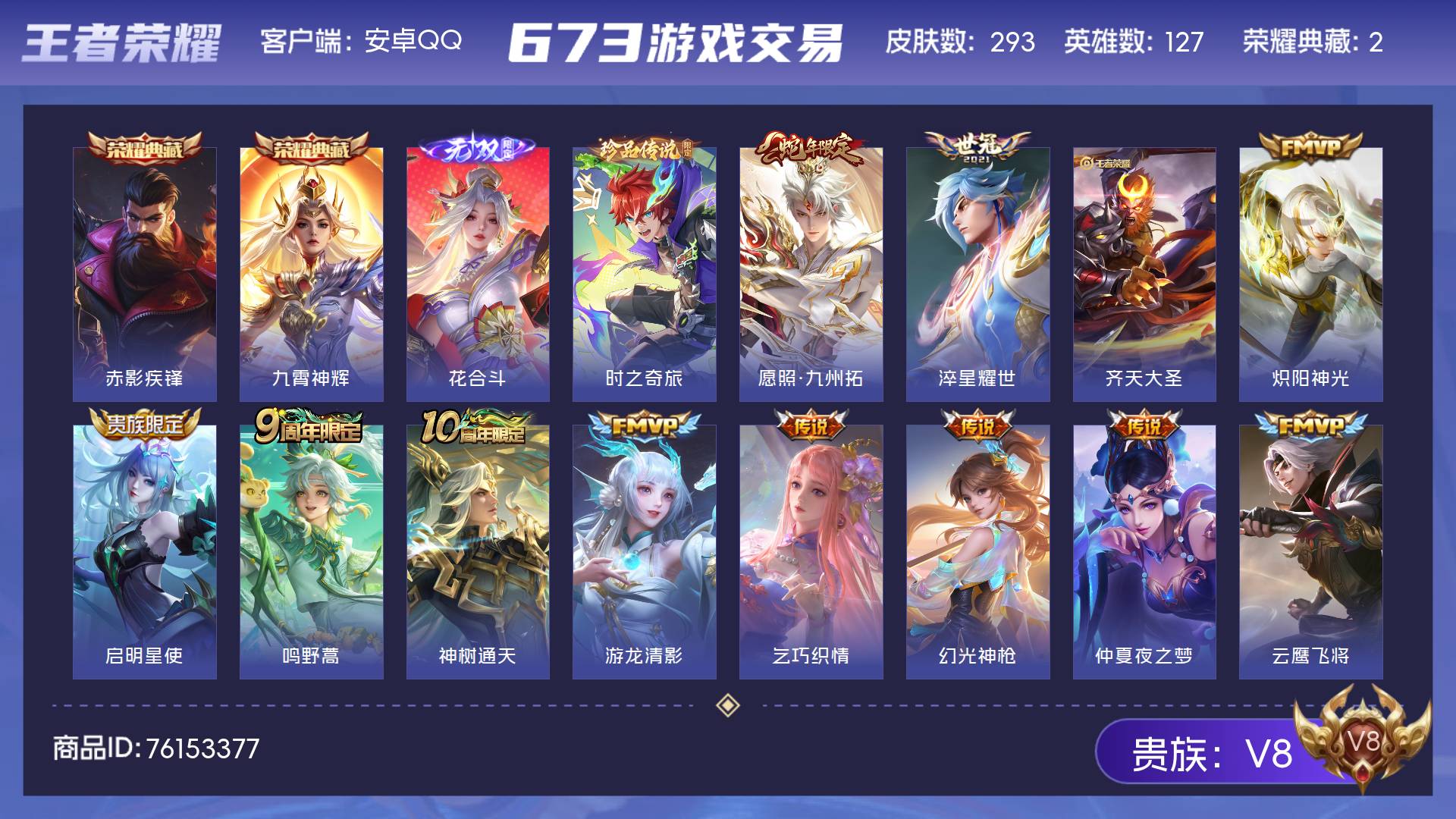 V8 皮肤293 英雄127 非凡王者 荣耀典藏2 无双皮肤1 珍品传说1 传说16