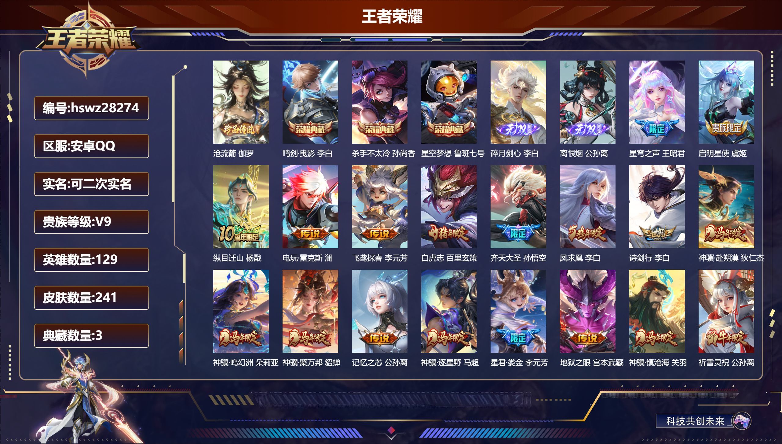 安卓QQ/永恒钻石/241皮肤/129英雄/3典藏/0珍品无双/2无双/1珍品传说/33传说/50史