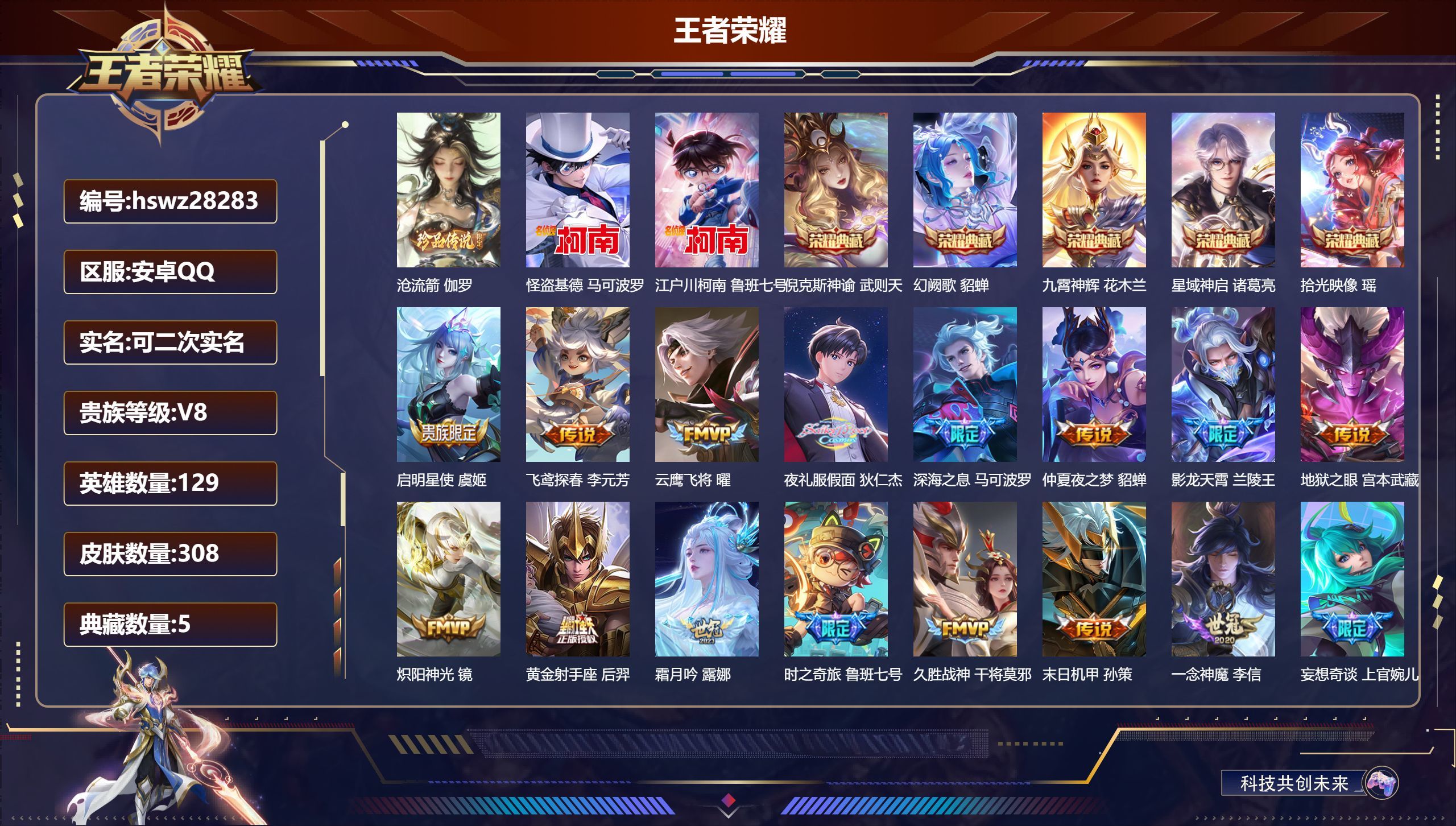 安卓QQ/至尊星耀/308皮肤/129英雄/5典藏/0珍品无双/0无双/3珍品传说/19传说/97史
