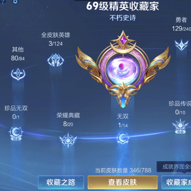 V7-至尊星耀III段位-129英雄-209皮肤-2典藏皮肤-14传说-56史诗