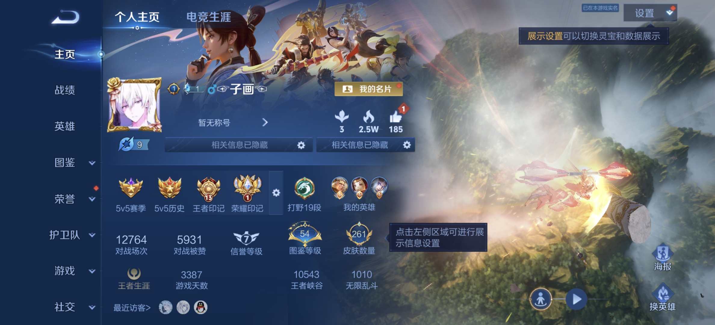 实名: 可修改 贵族等级: V7 英雄数: 127 皮肤数: 230 荣耀水晶