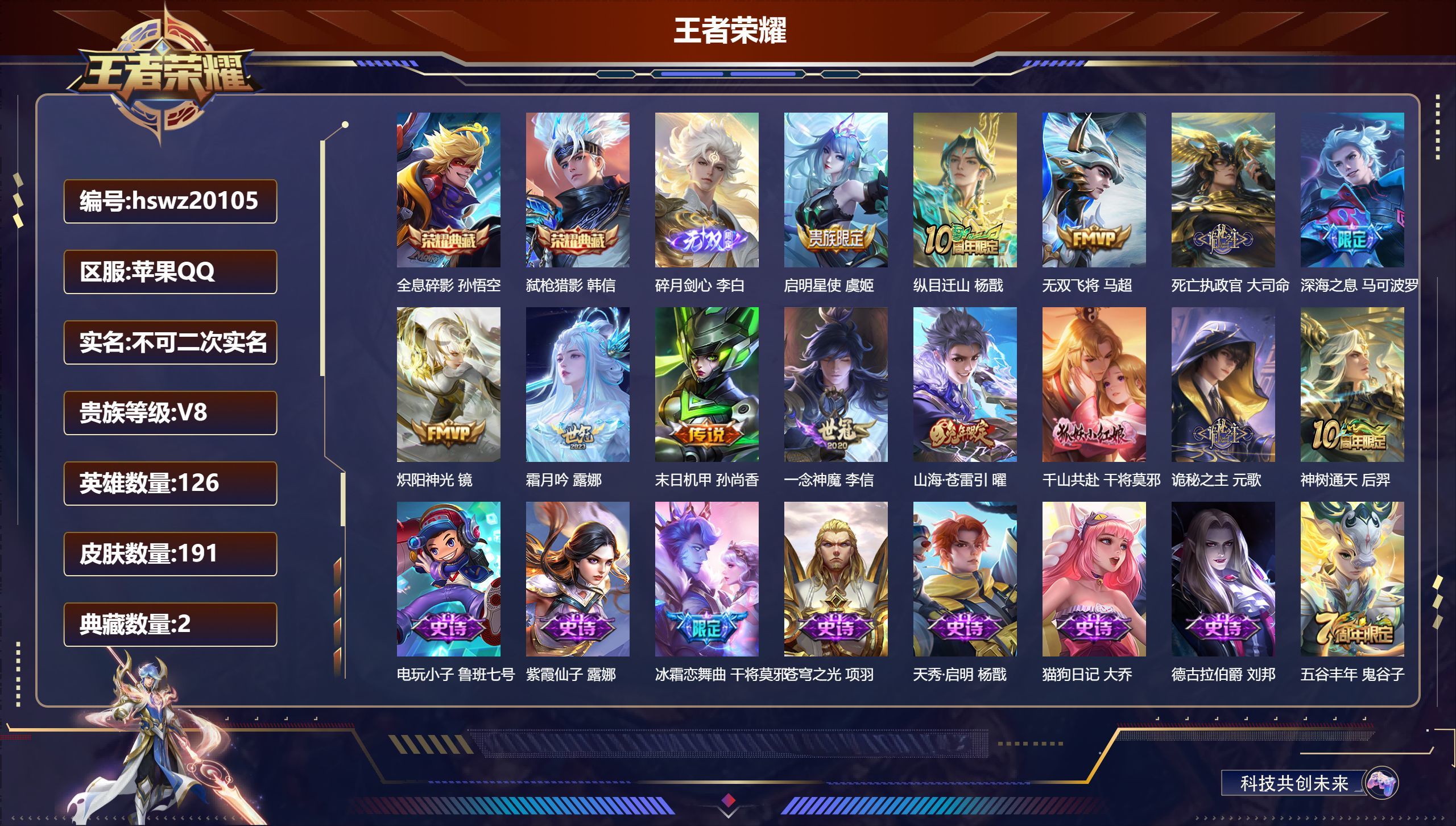 苹果QQ/荣耀王者/191皮肤/126英雄/2典藏/0珍品无双/1无双/0珍品传说/13传说/59史