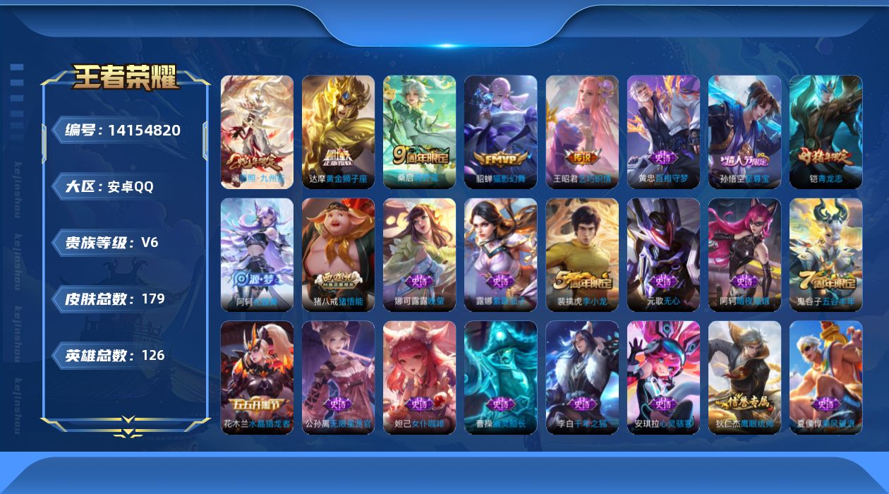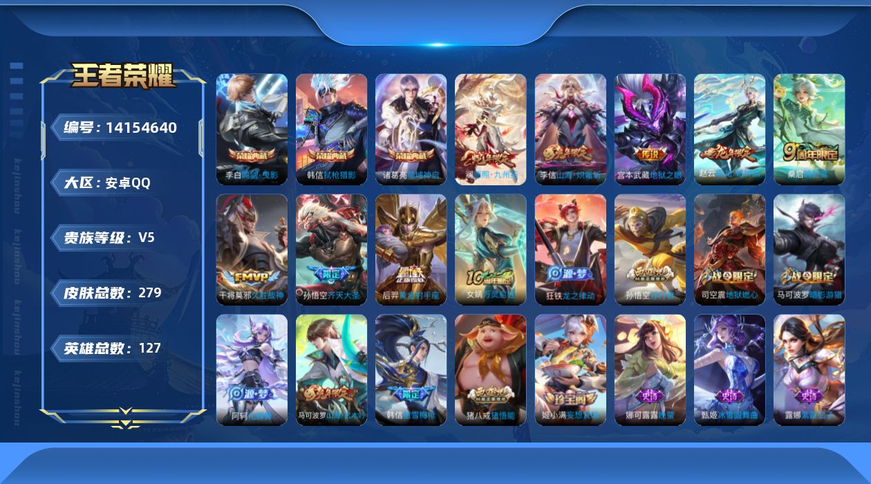 安卓QQ/至圣王者/264皮肤/127英雄/2典藏/0珍品无双/4无双/2珍品传说/24传说/75史
