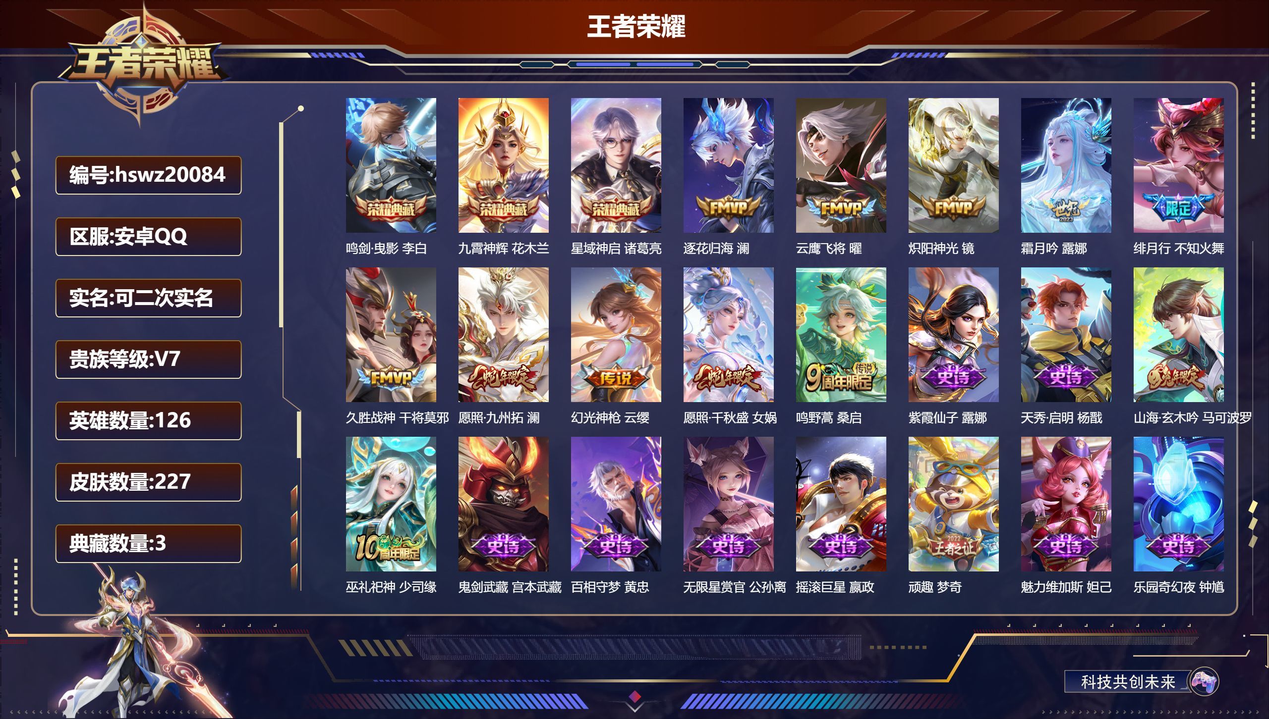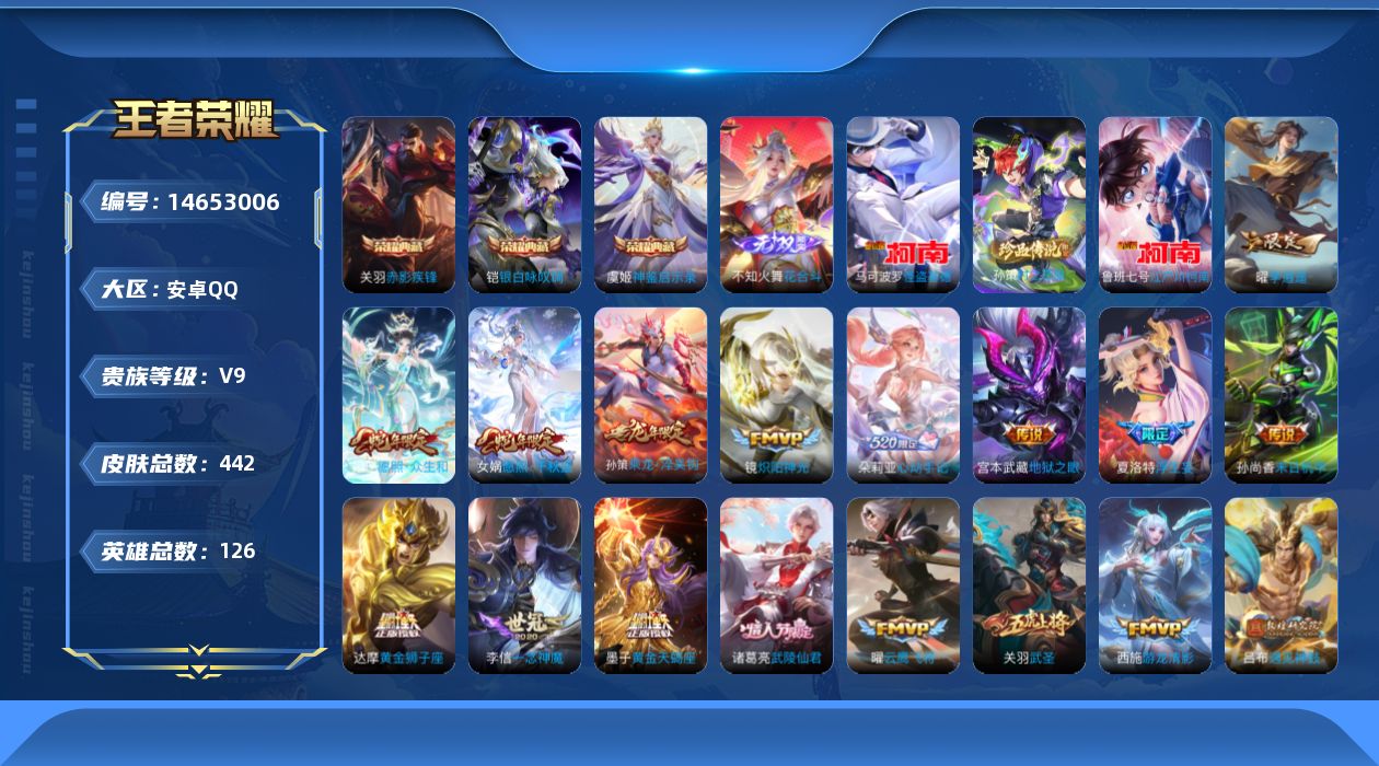 安卓QQ/荣耀王者/227皮肤/126英雄/3典藏/0珍品无双/0无双/0珍品传说/10传说/55史