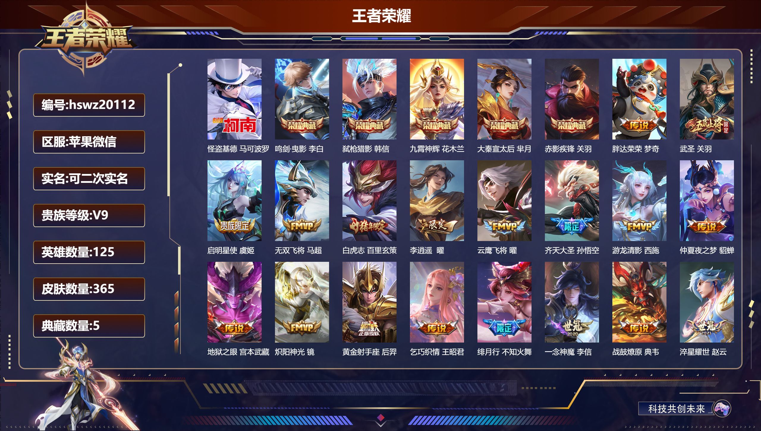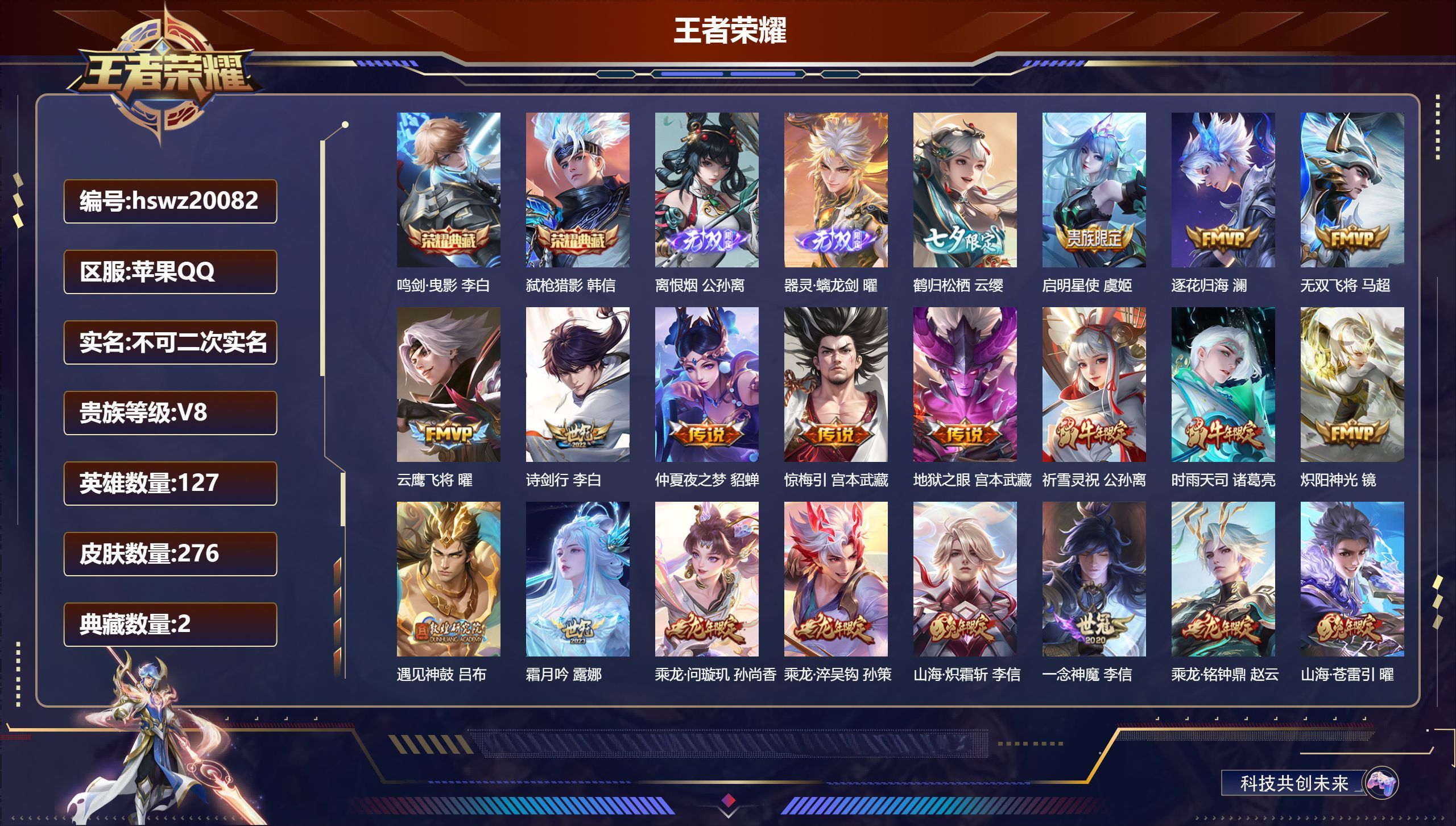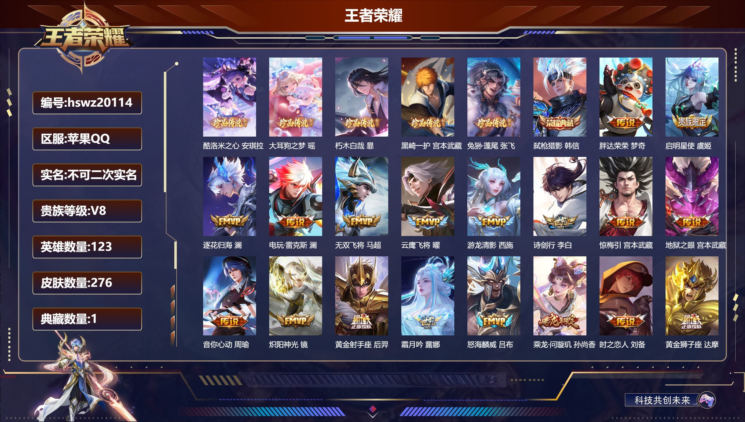 苹果QQ/荣耀王者/276皮肤/123英雄/1典藏/1珍品无双/0无双/5珍品传说/34传说/72史