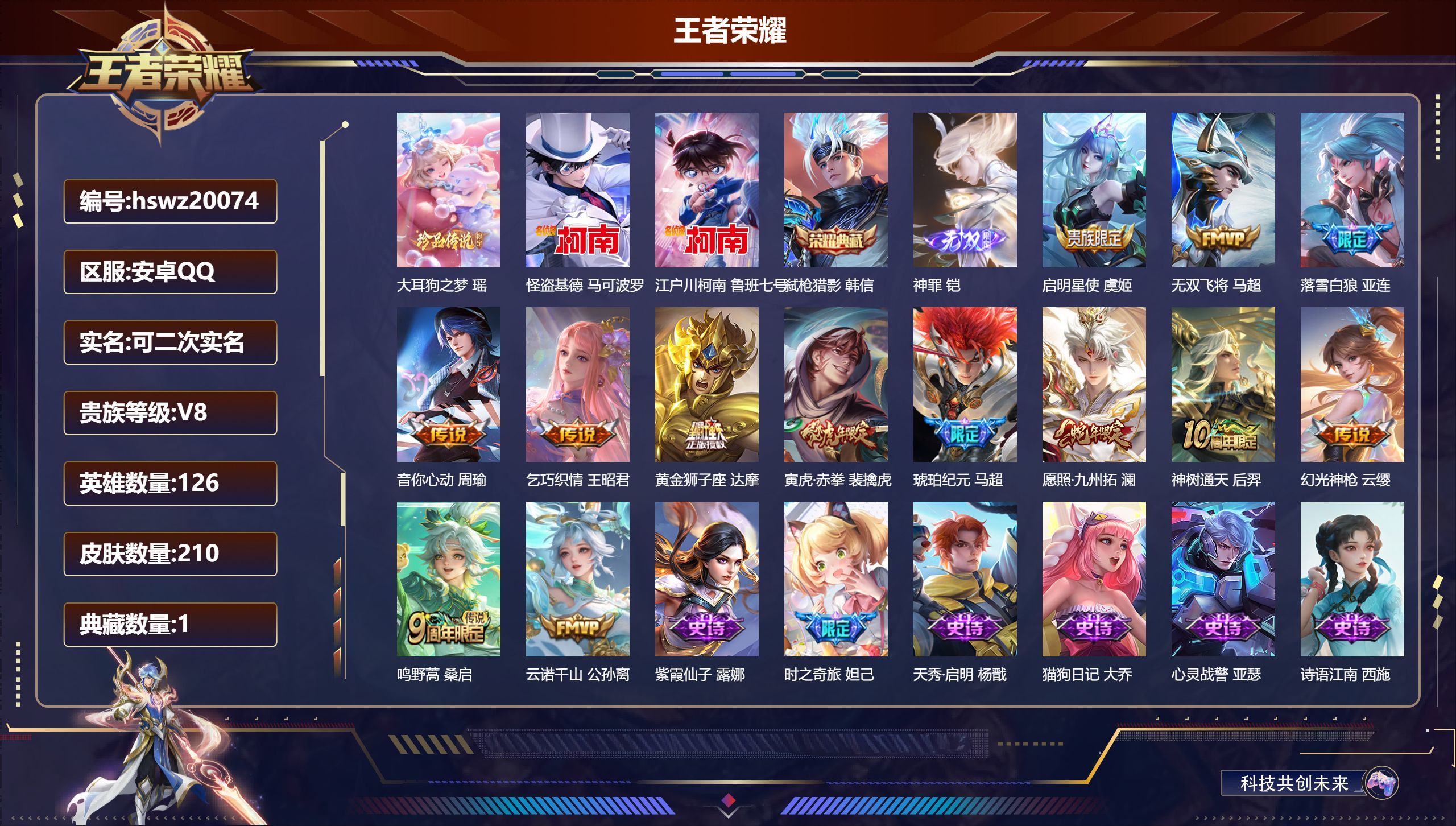 安卓QQ/至尊星耀/210皮肤/126英雄/1典藏/0珍品无双/1无双/3珍品传说/13传说/62史