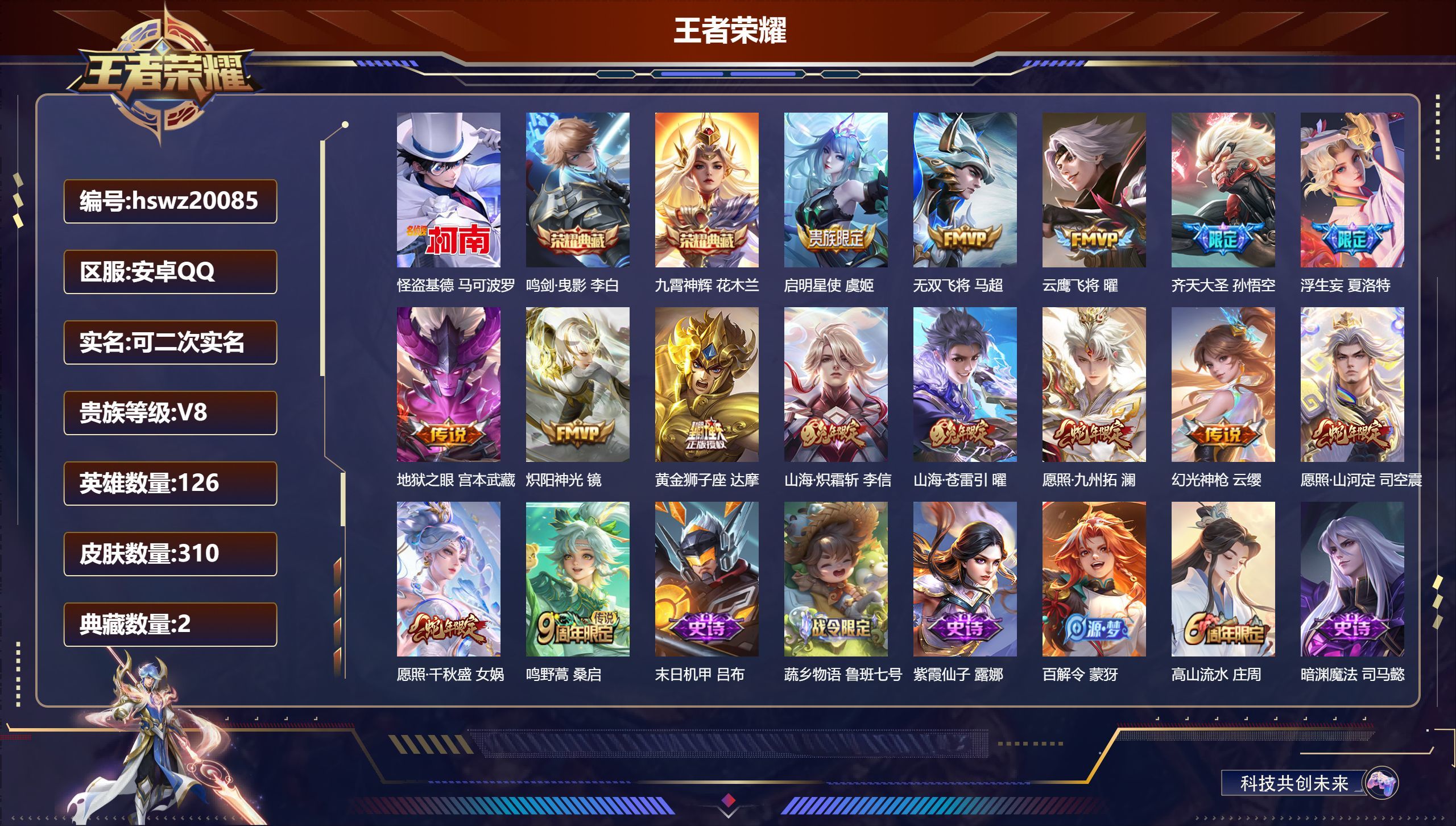 安卓QQ/无双王者/310皮肤/126英雄/2典藏/0珍品无双/0无双/1珍品传说/15传说/86史