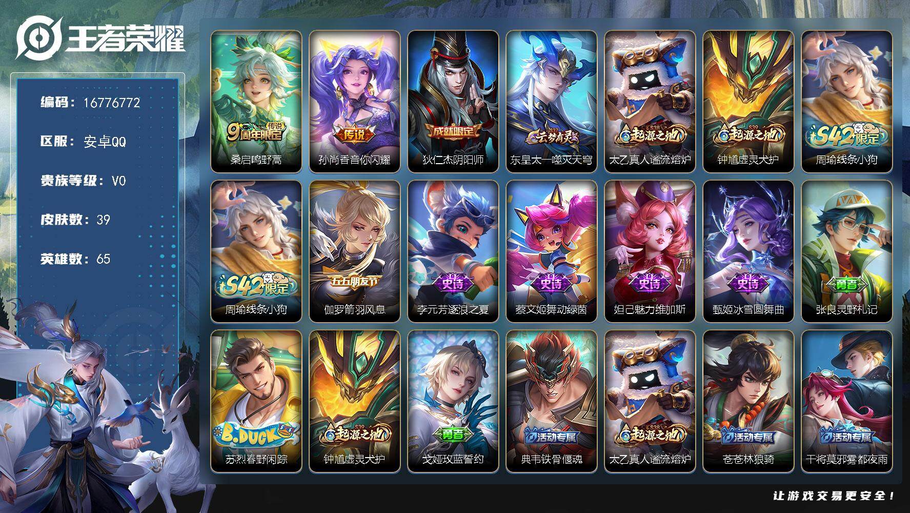 【16776772】贵族0/皮肤39/传说2/史诗5/英雄65/桑启-鸣野蒿/