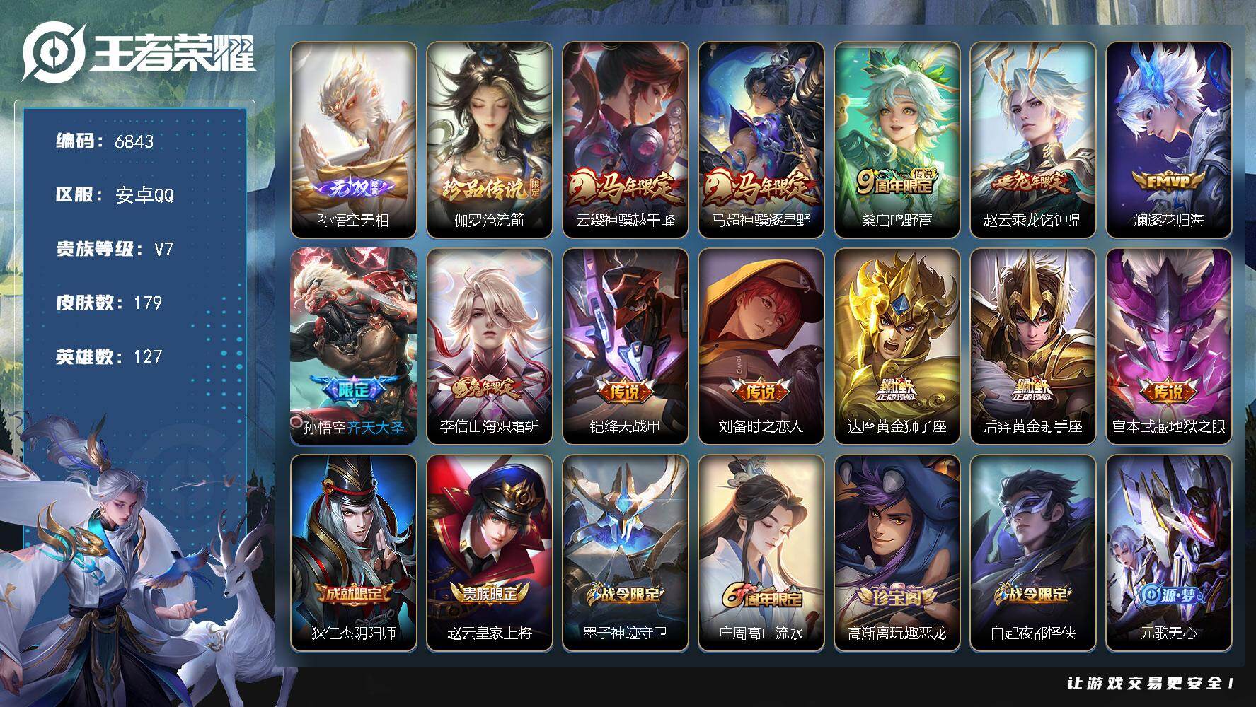 【秒换绑】安卓Q-V6-最强王者段位-127英雄-177皮肤-1珍品传说-7传