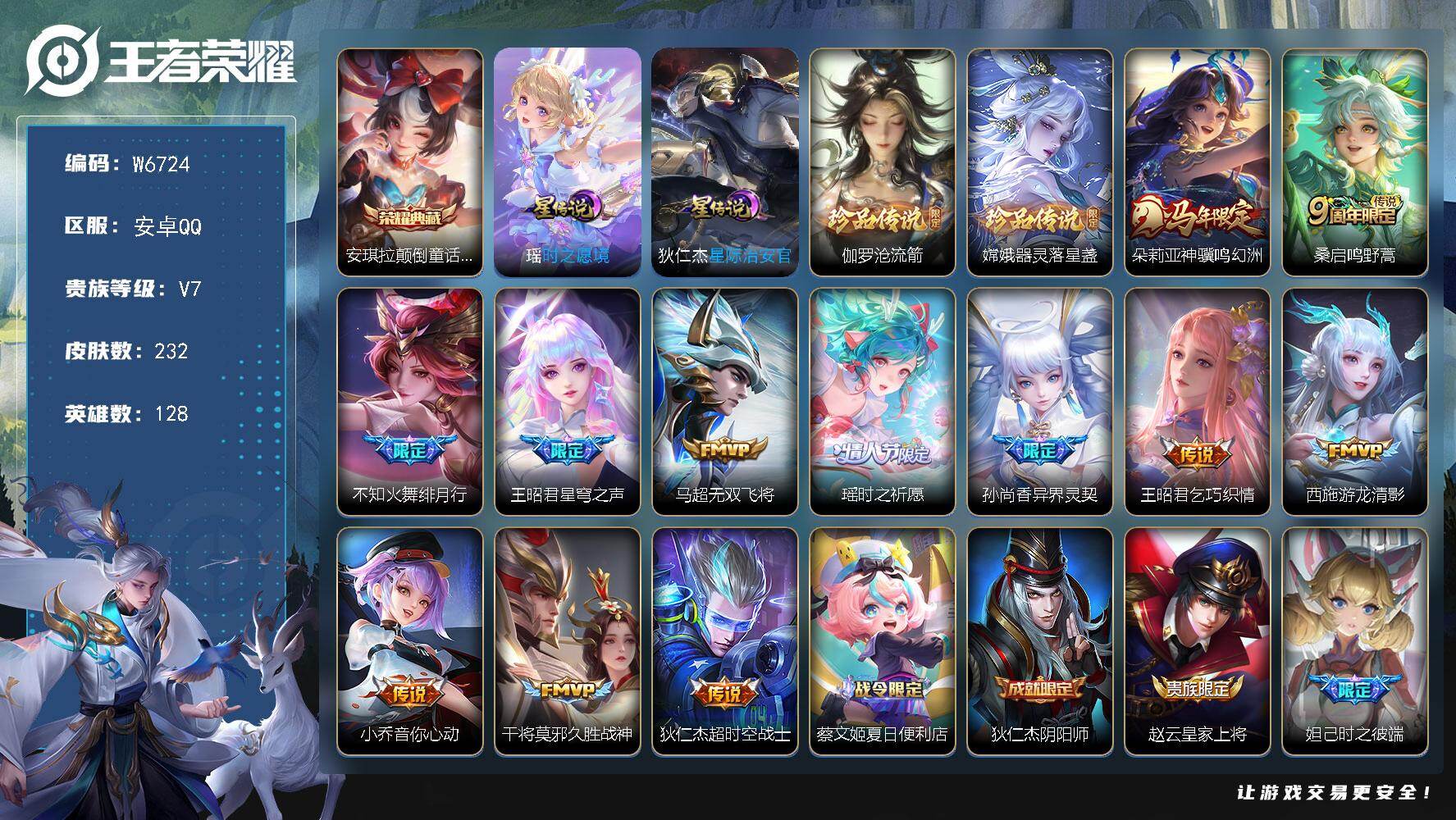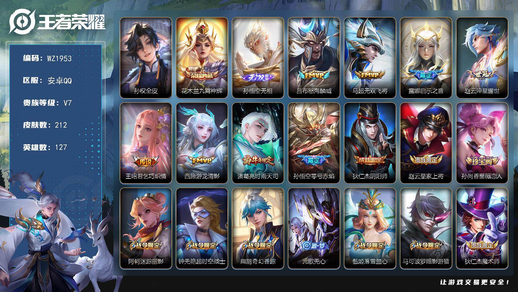 【秒换绑】安卓Q-V7-最强王者段位-128英雄-244皮肤-1典藏皮肤-1无