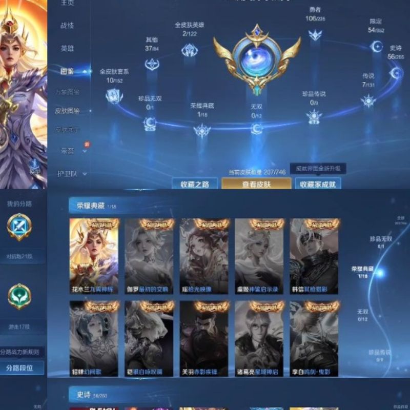 贵族7 荣耀典藏1 传说皮肤7 史诗皮肤56 皮肤数量207