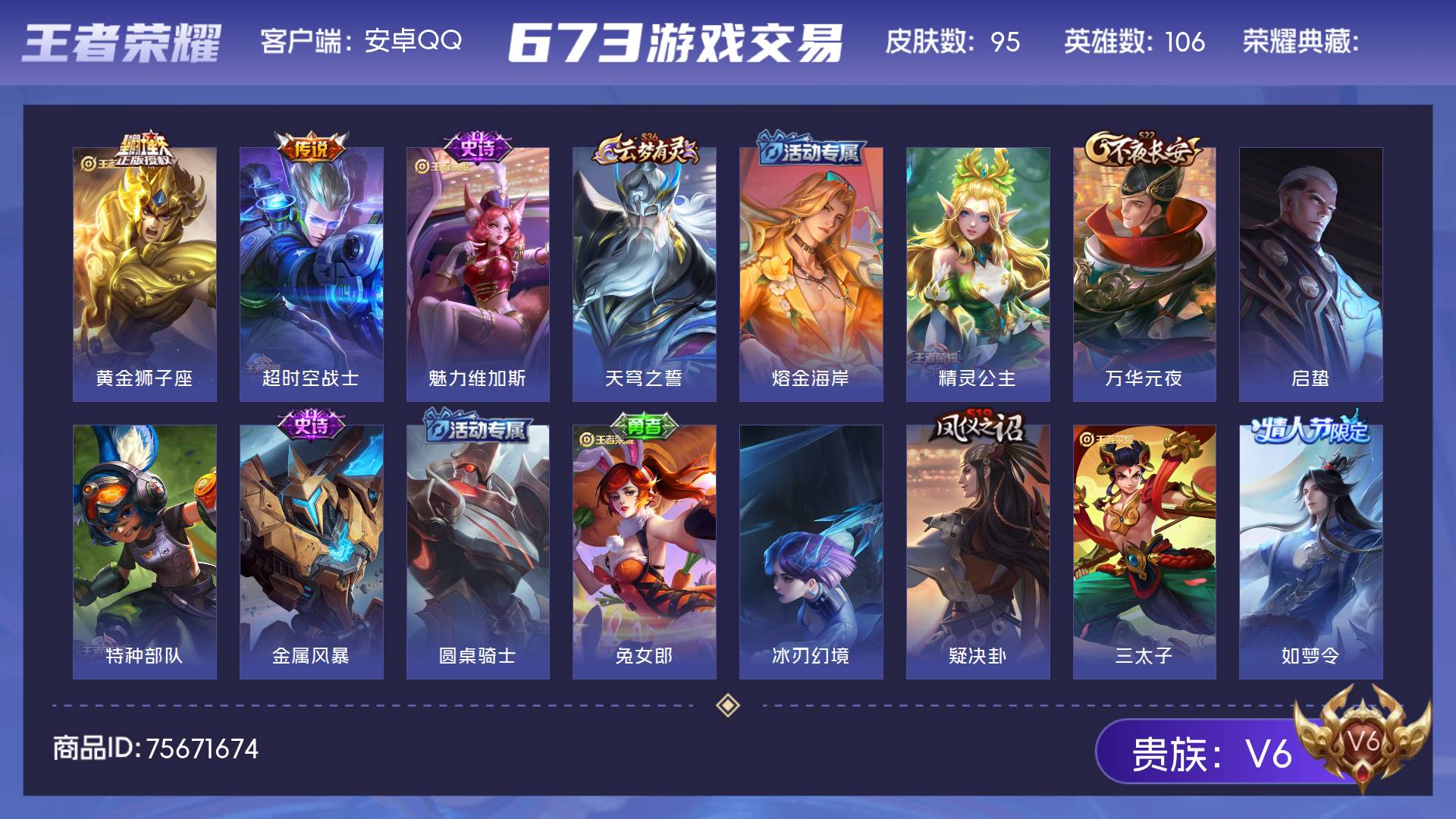 V6 皮肤95 英雄106 永恒钻石 传说2 其他皮肤99