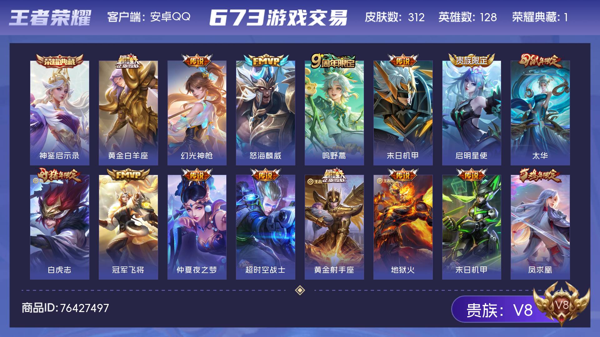 V8 皮肤312 英雄128 尊贵铂金 荣耀典藏1 传说16