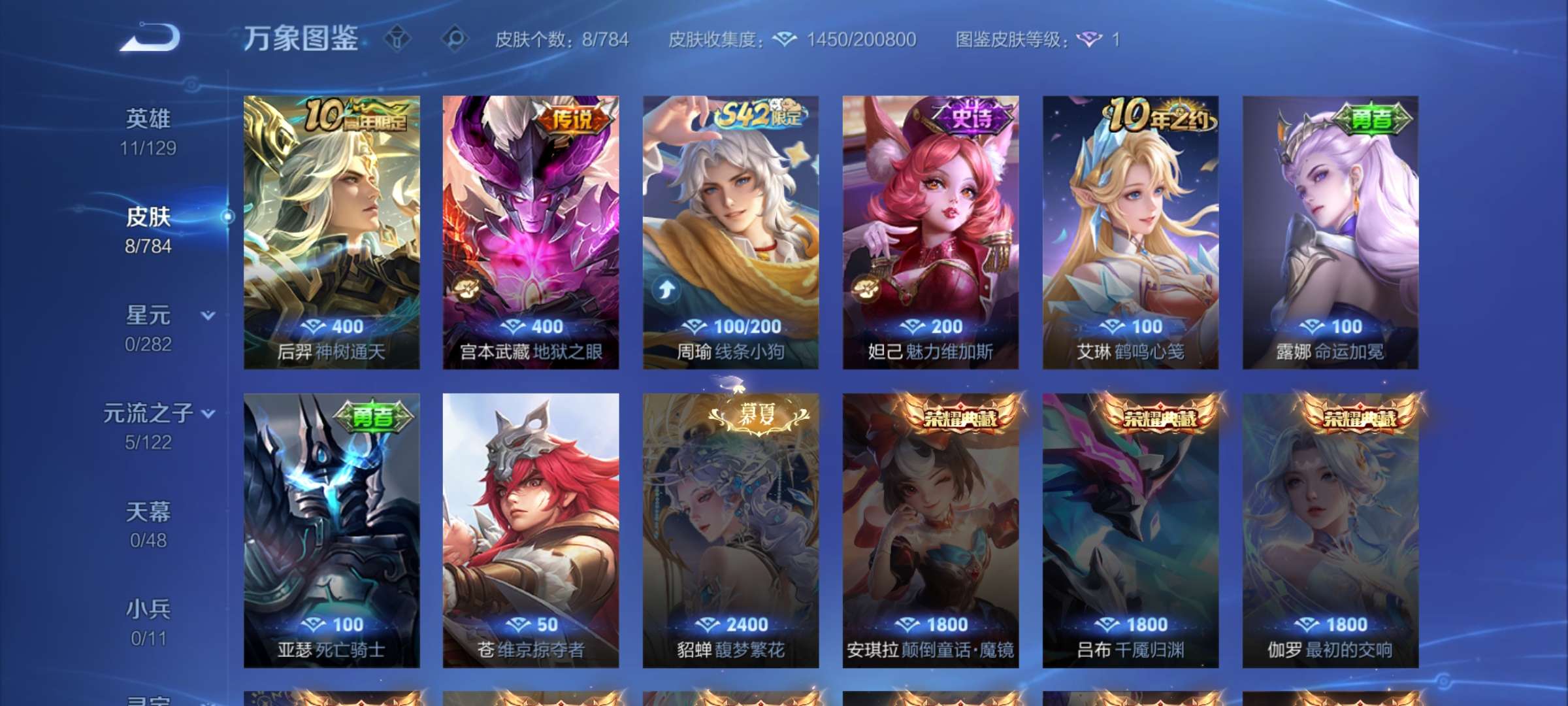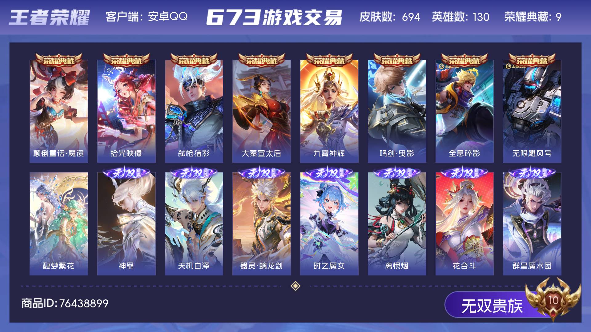 无双贵族 皮肤694 英雄130 至尊星耀 荣耀典藏9 珍品无双1 无双皮肤8 珍品传说8 星传说9 传说114