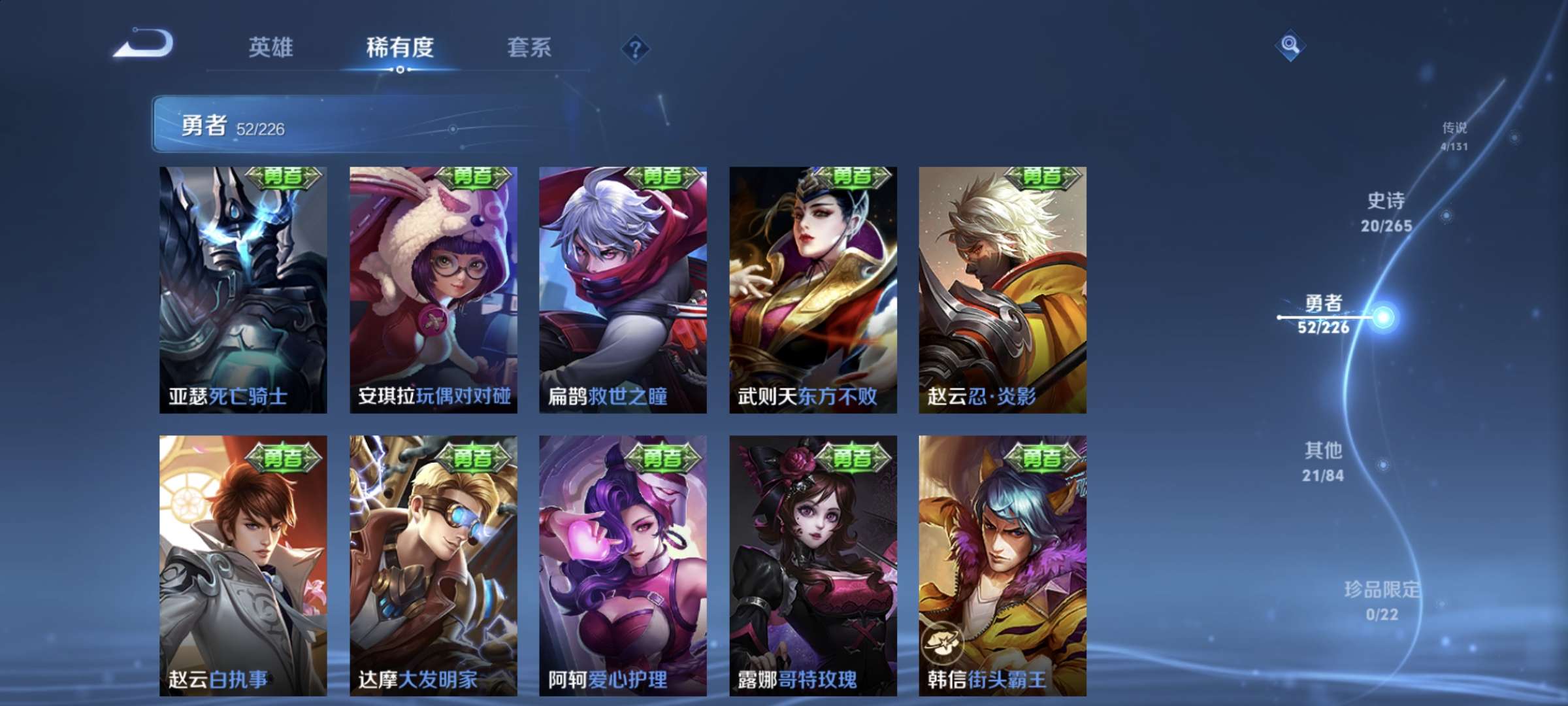 贵族7/皮肤189/典藏1/传说12/史诗60/英雄125/