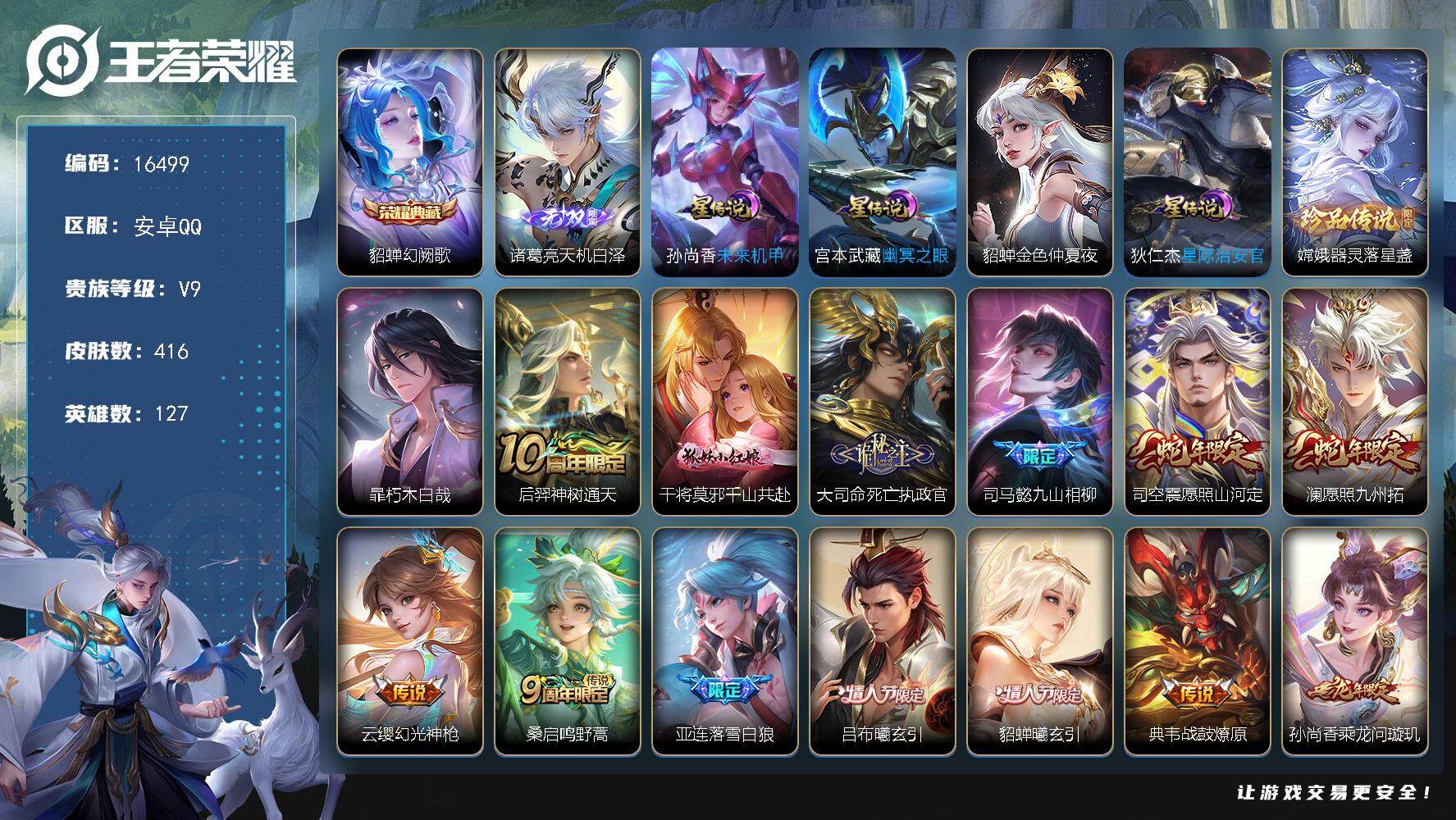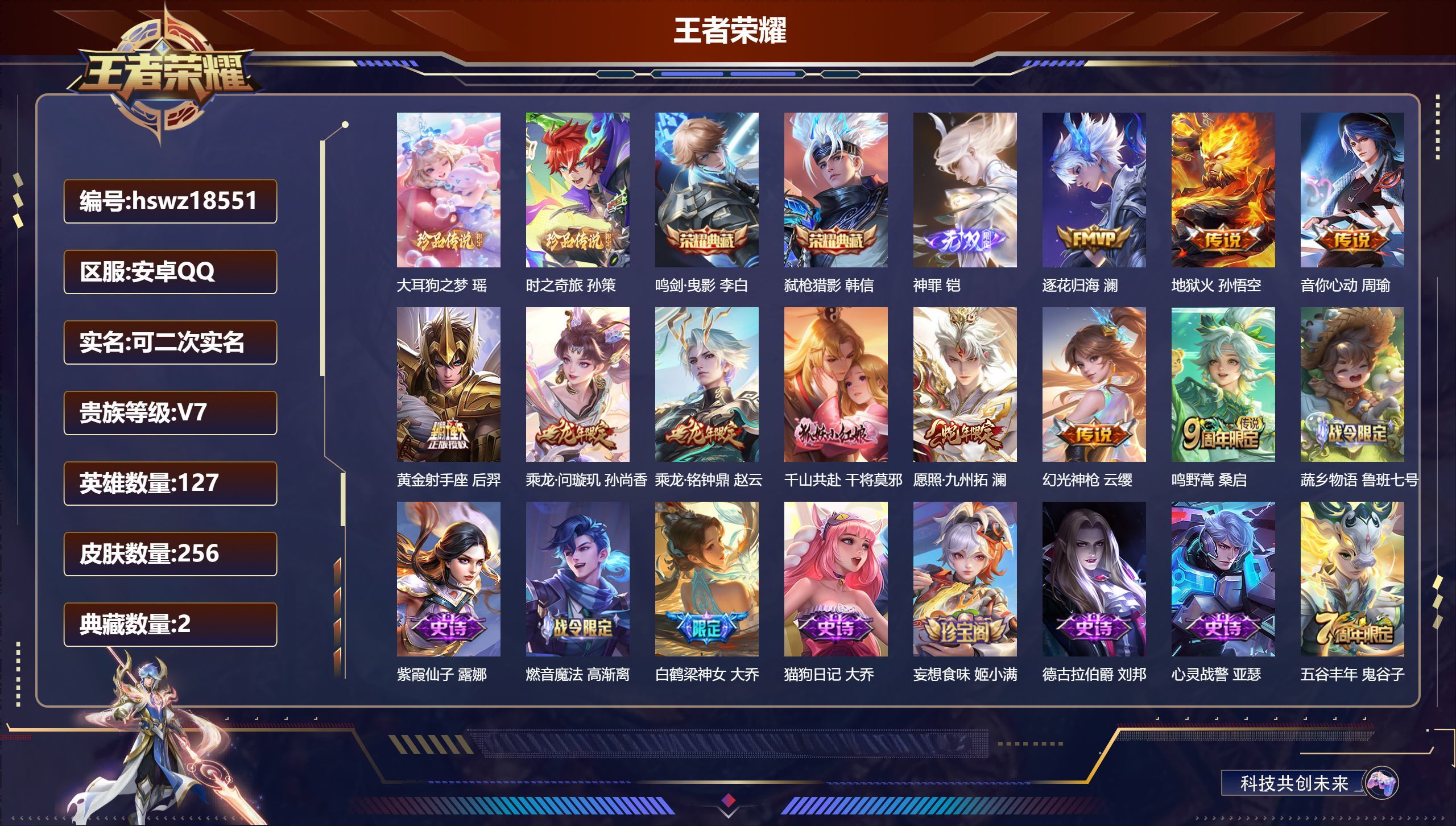 安卓QQ/荣耀王者/256皮肤/127英雄/2典藏/0珍品无双/1无双/2珍品传说/10传说/75史